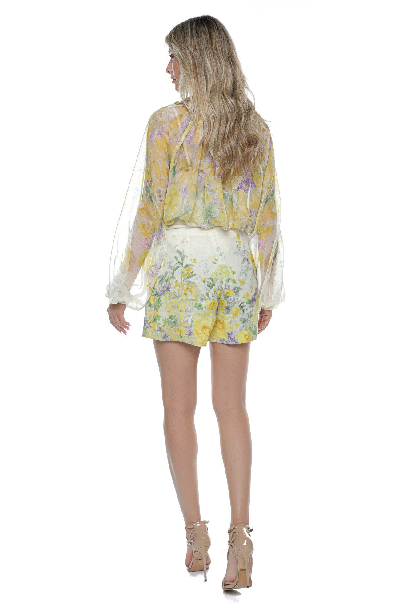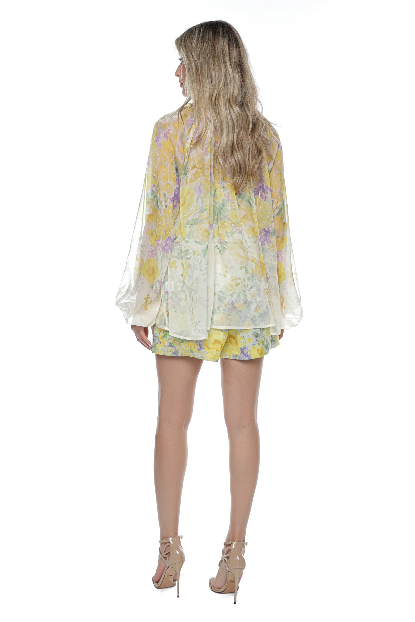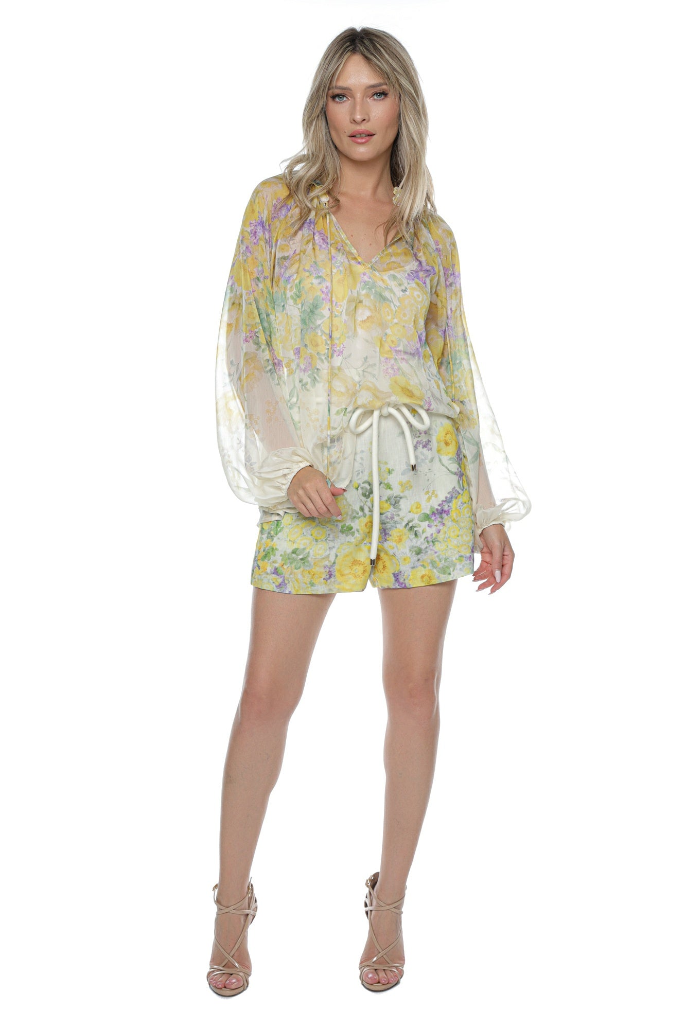 Descriere: Bluza dama din voal subtire translucid cu impriimeu floral in nuante de galben, mov si verde pastel. Croiala larga cu maneci lungi vaporoase. Detalii florale aplicate pe umar. Devolteu in v cu legaturi decorative. Pe dedesupt are un maiou din lycra.