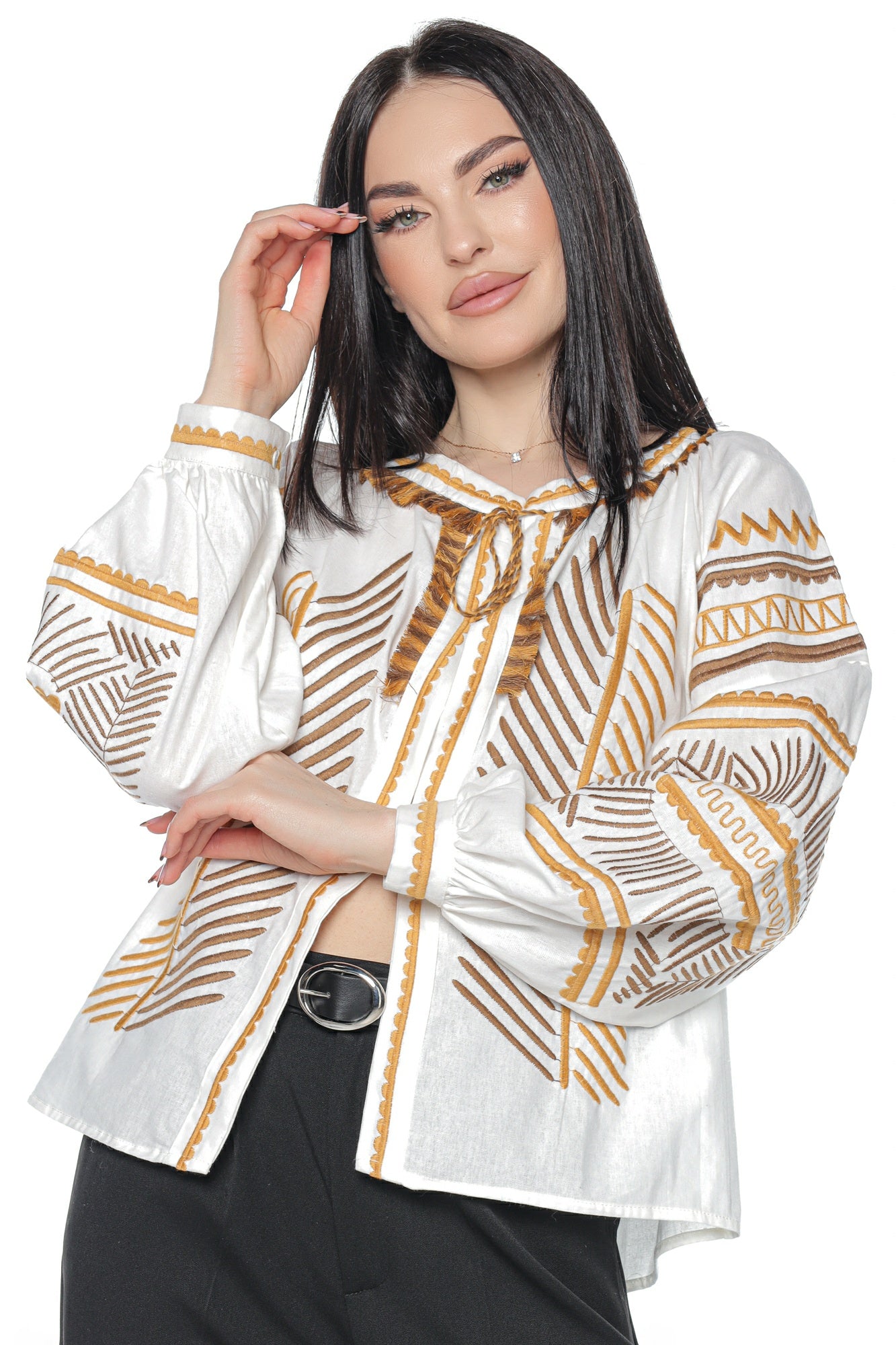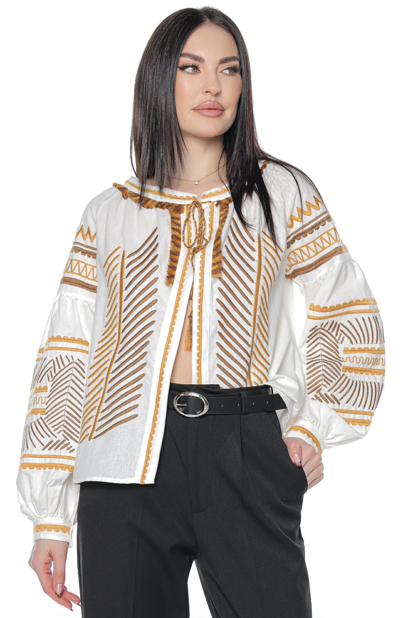 Descriere: Bluza dama tip jacheta cu motive traditionale mustar. Maneca bufanta. Accesorizata cu snur la gat.