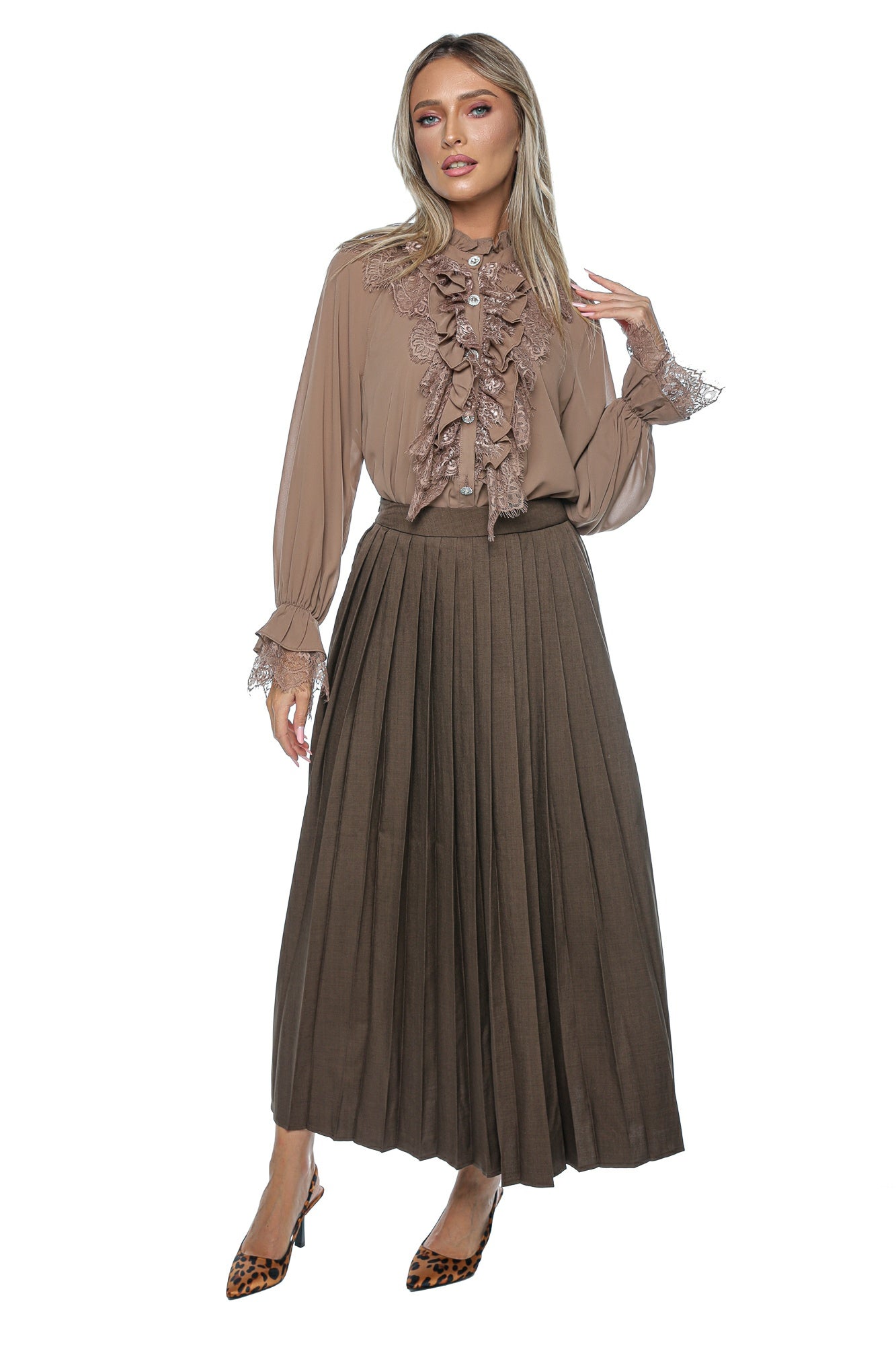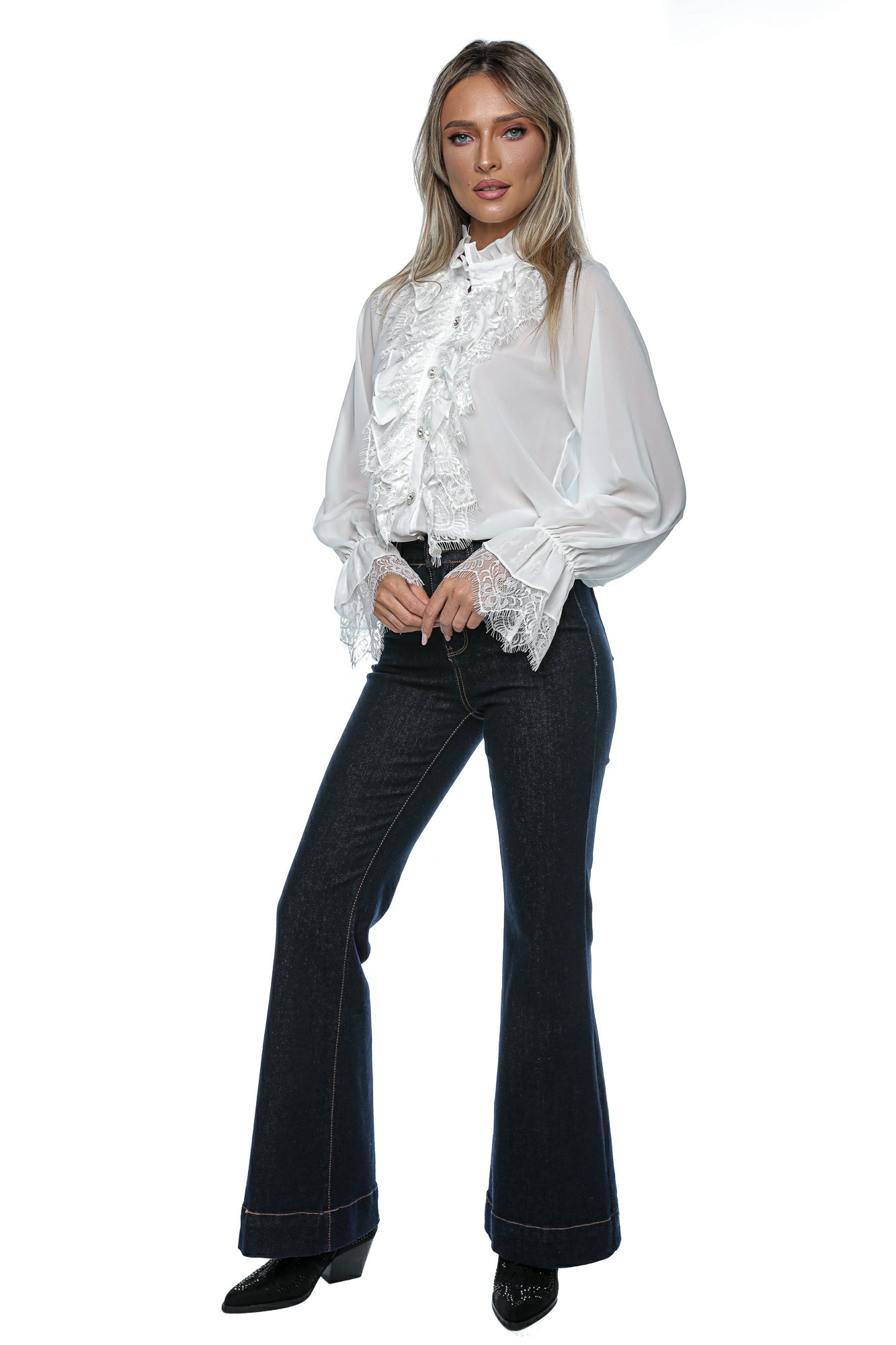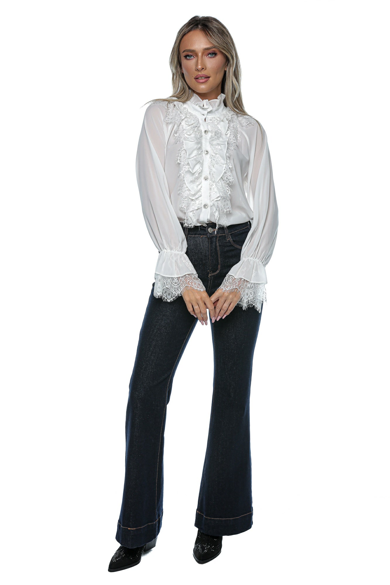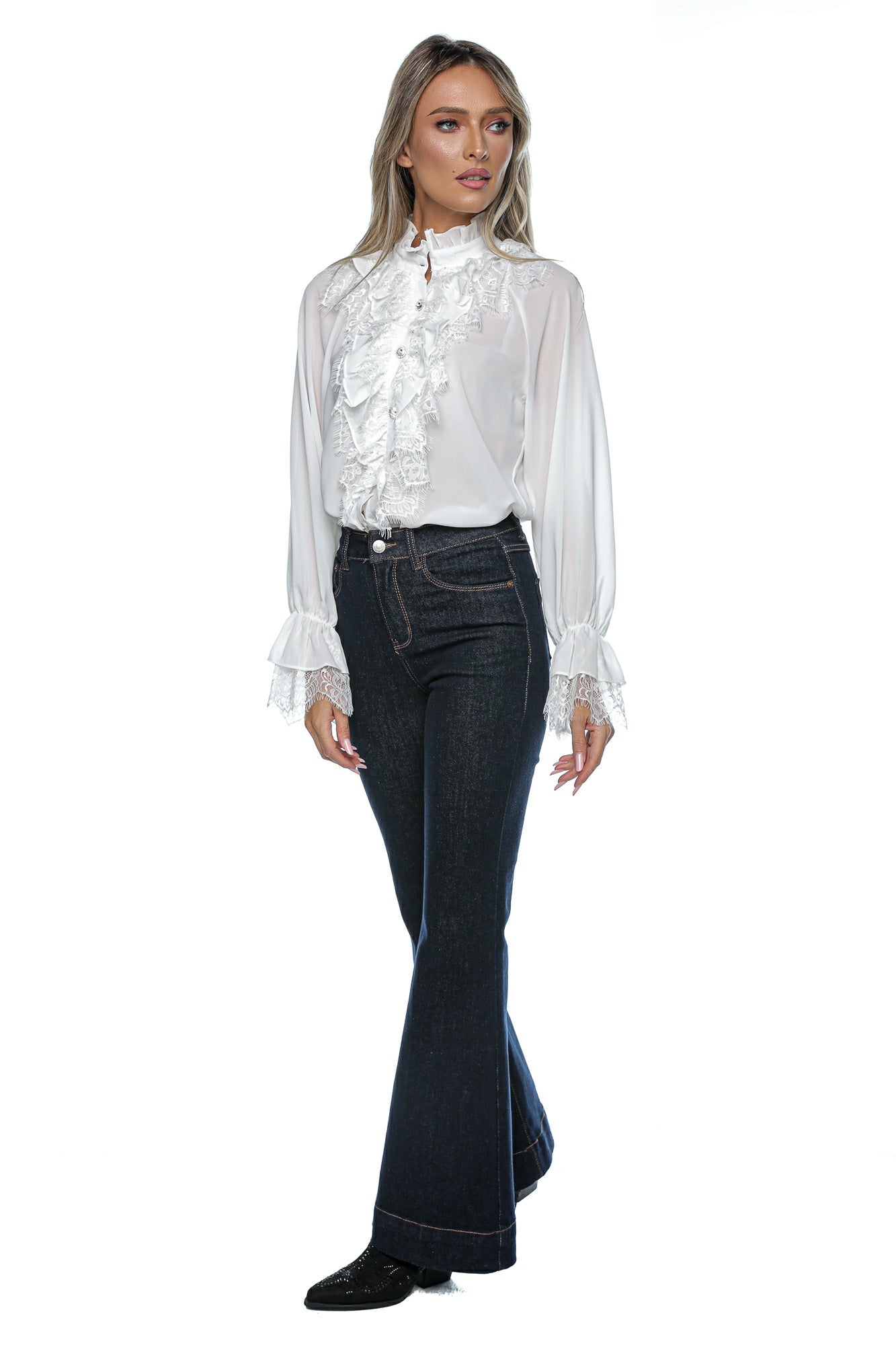 Descriere Cămașă elegantă cu volane și dantelă este piesa ideală pentru un look rafinat și feminin. Confecționată din material vaporos, are un design cu volane și inserții de dantelă aplicate în partea frontală și la manșete, care adaugă un plus de romantism și sofisticare. Croiala lejeră oferă confort, în timp ce nasturii frontali completează aspectul clasic și elegant.