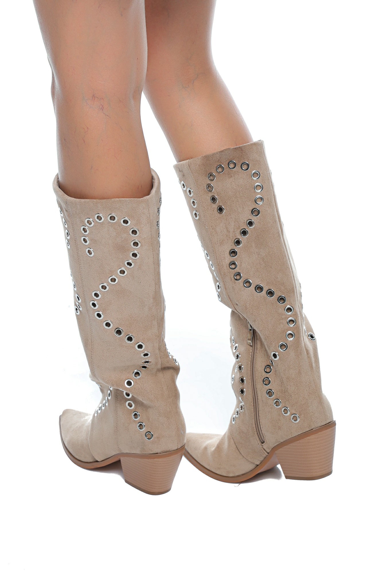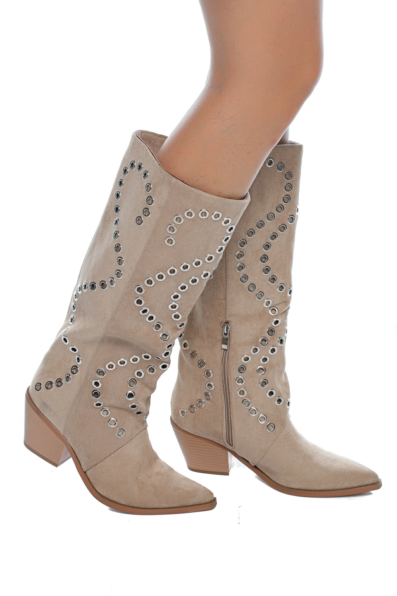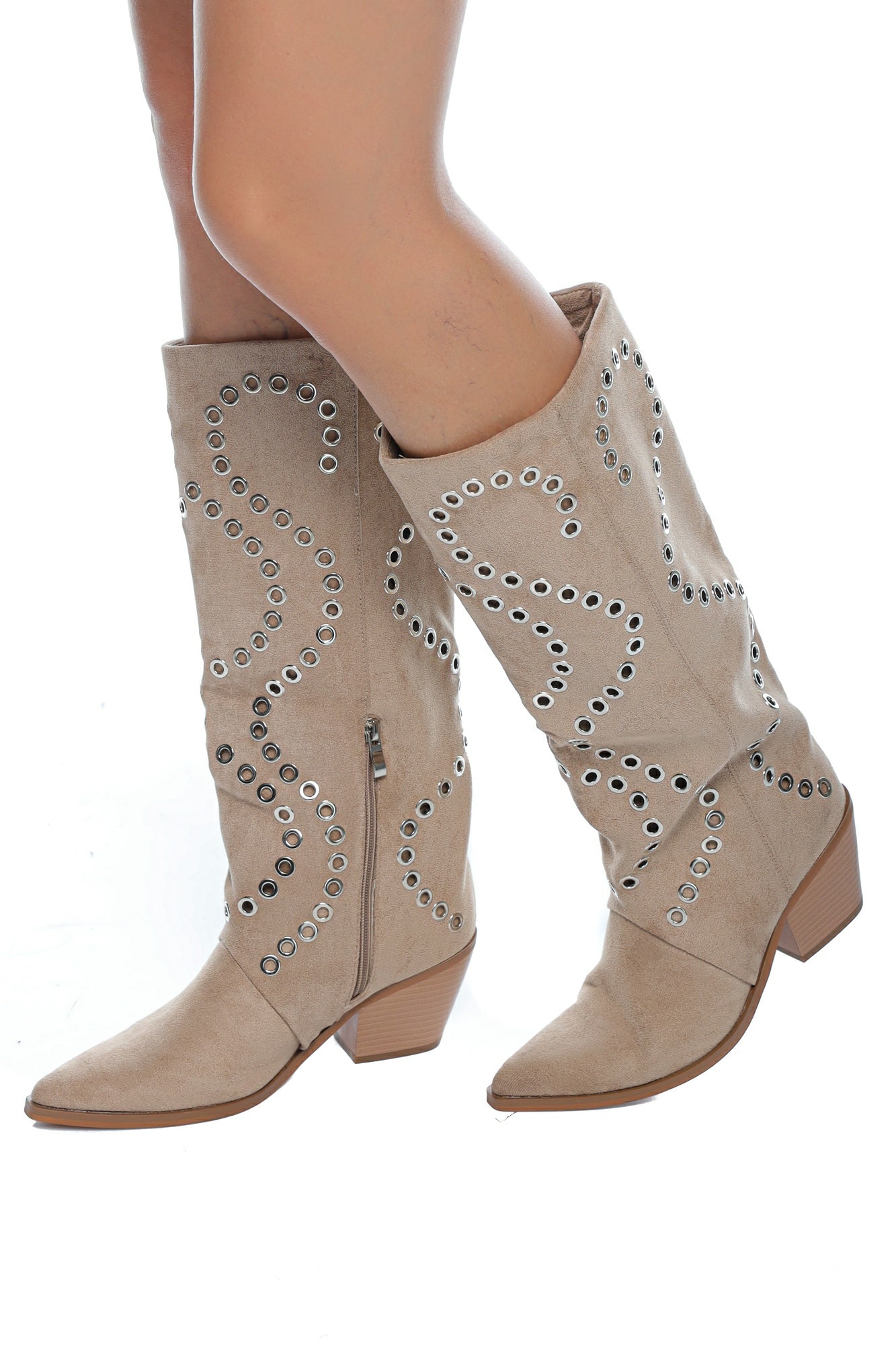 Descriere: Cizme damă cowboy bej cu ținte metalice și toc mediu, realizate din material tip velur (imitație piele întoarsă), decorate cu aplicații metalice tip ținte dispuse în modele curbe. Designul unic atrage atenția și transformă aceste cizme într-o piesă statement pentru garderoba ta.