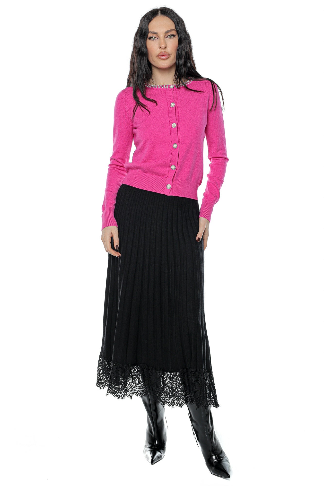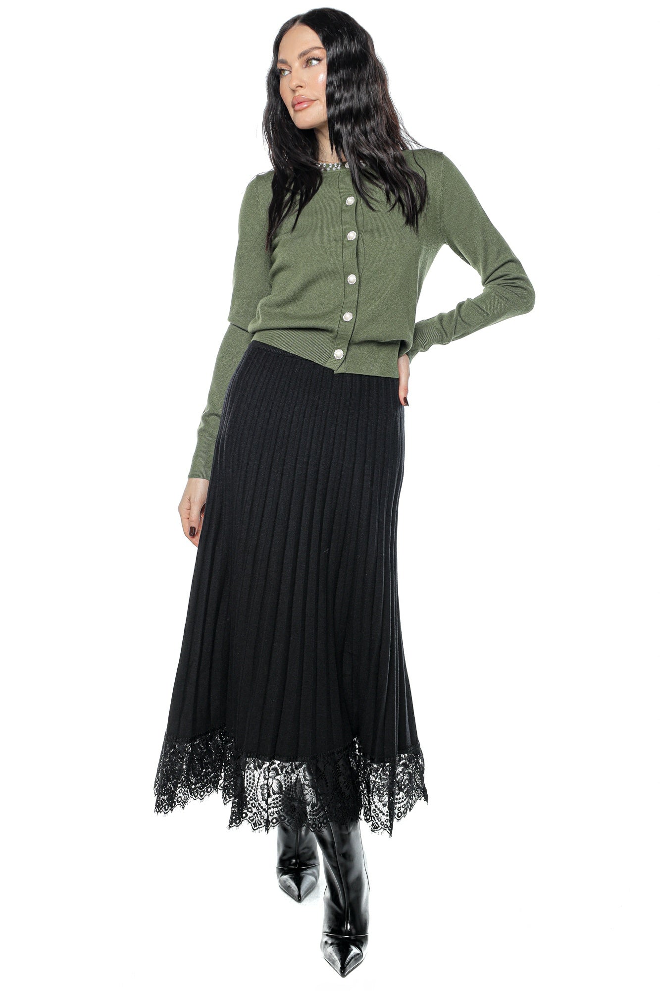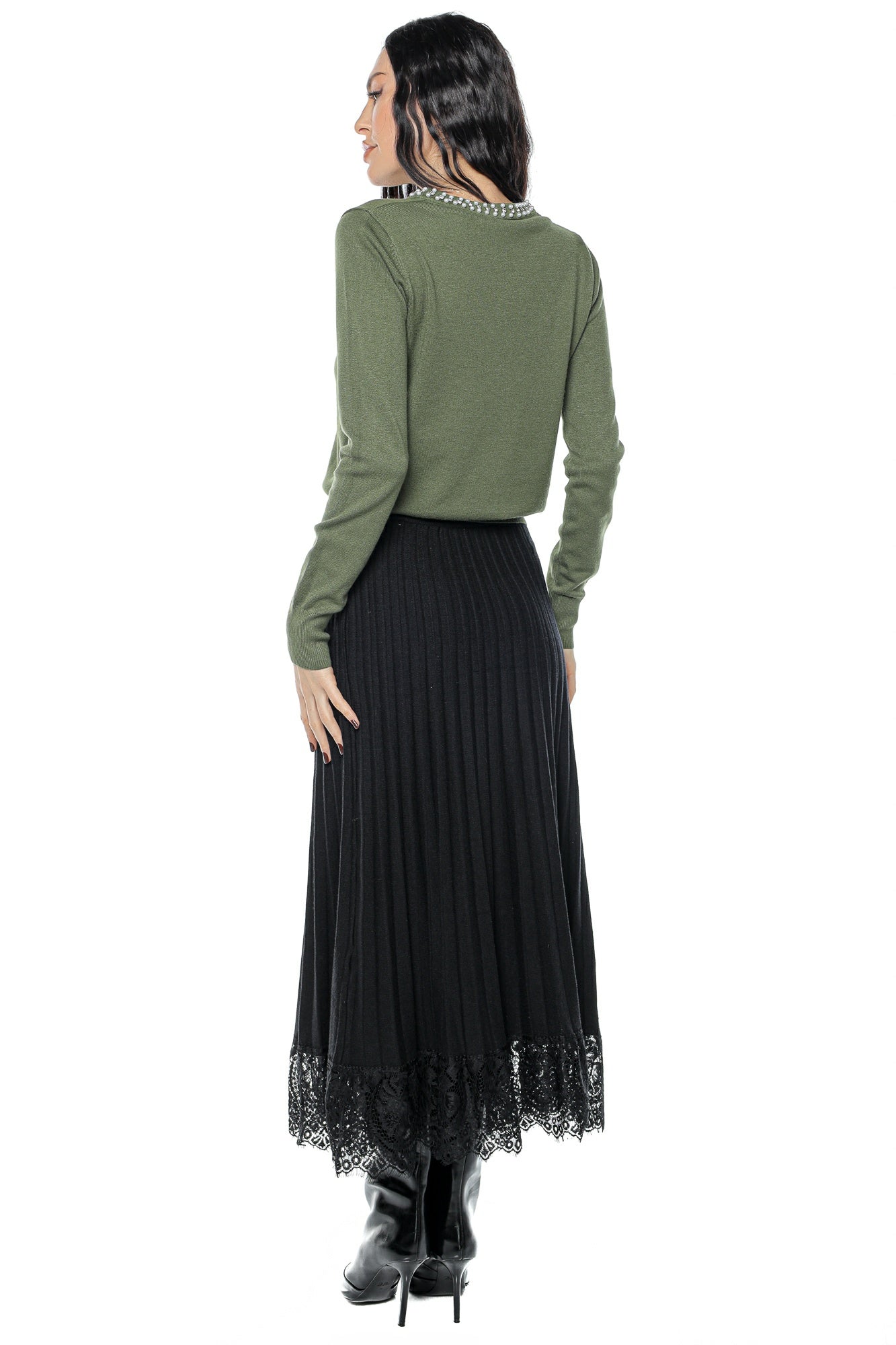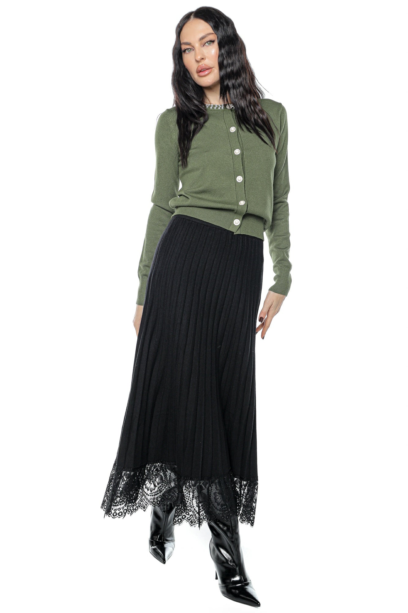 Descriere: Fusta lunga eleganta plisata din tricot cu terminatie de dantela.
