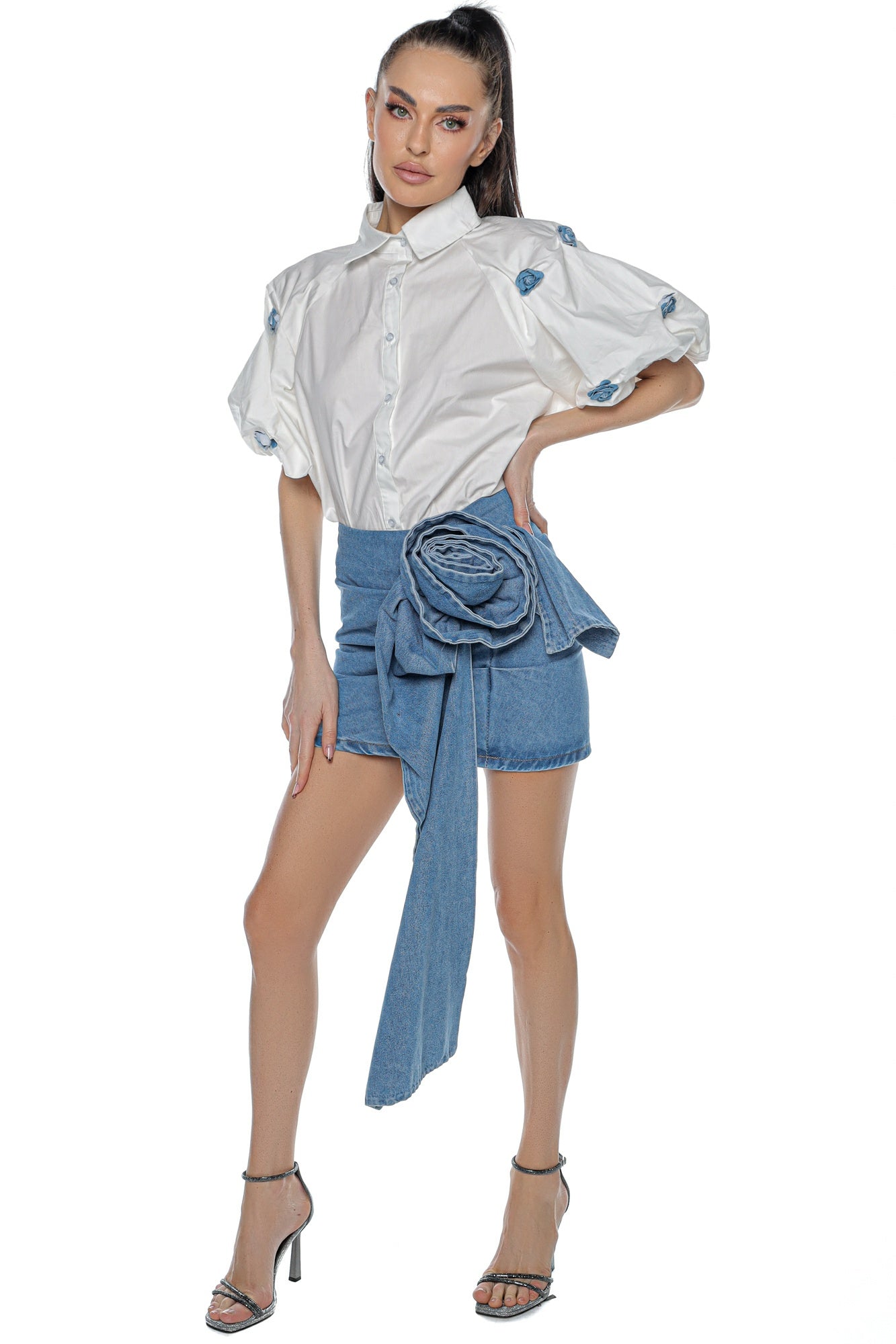 Descriere: Fusta scurta din jeans casual cu floare mare 3d aplicata intr-o parte. Se inchide cu fermoar intr-o parte.