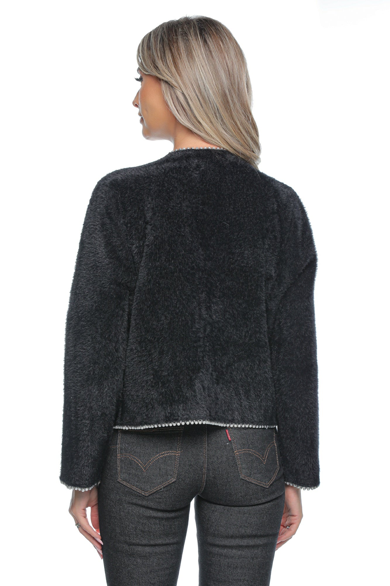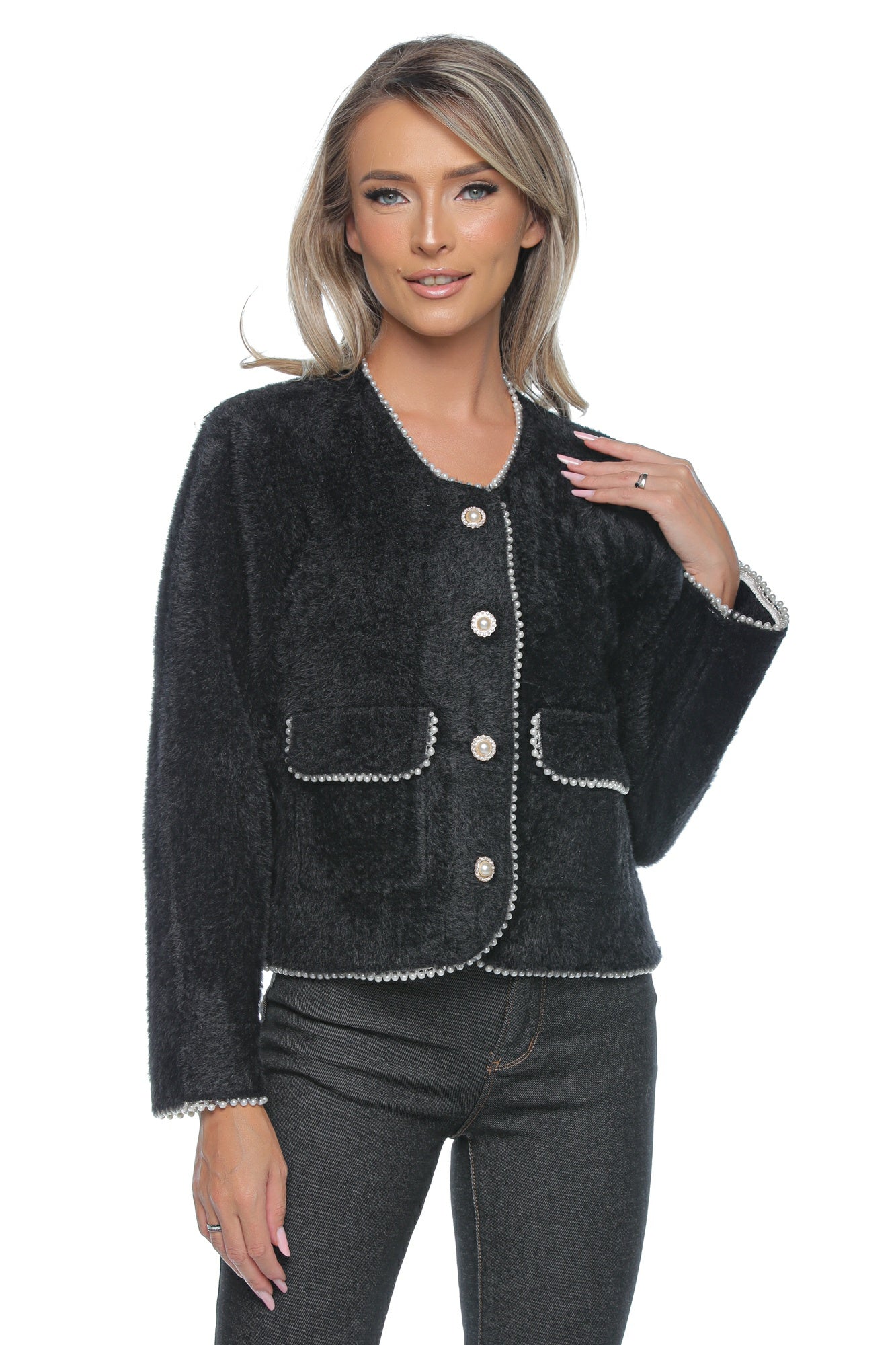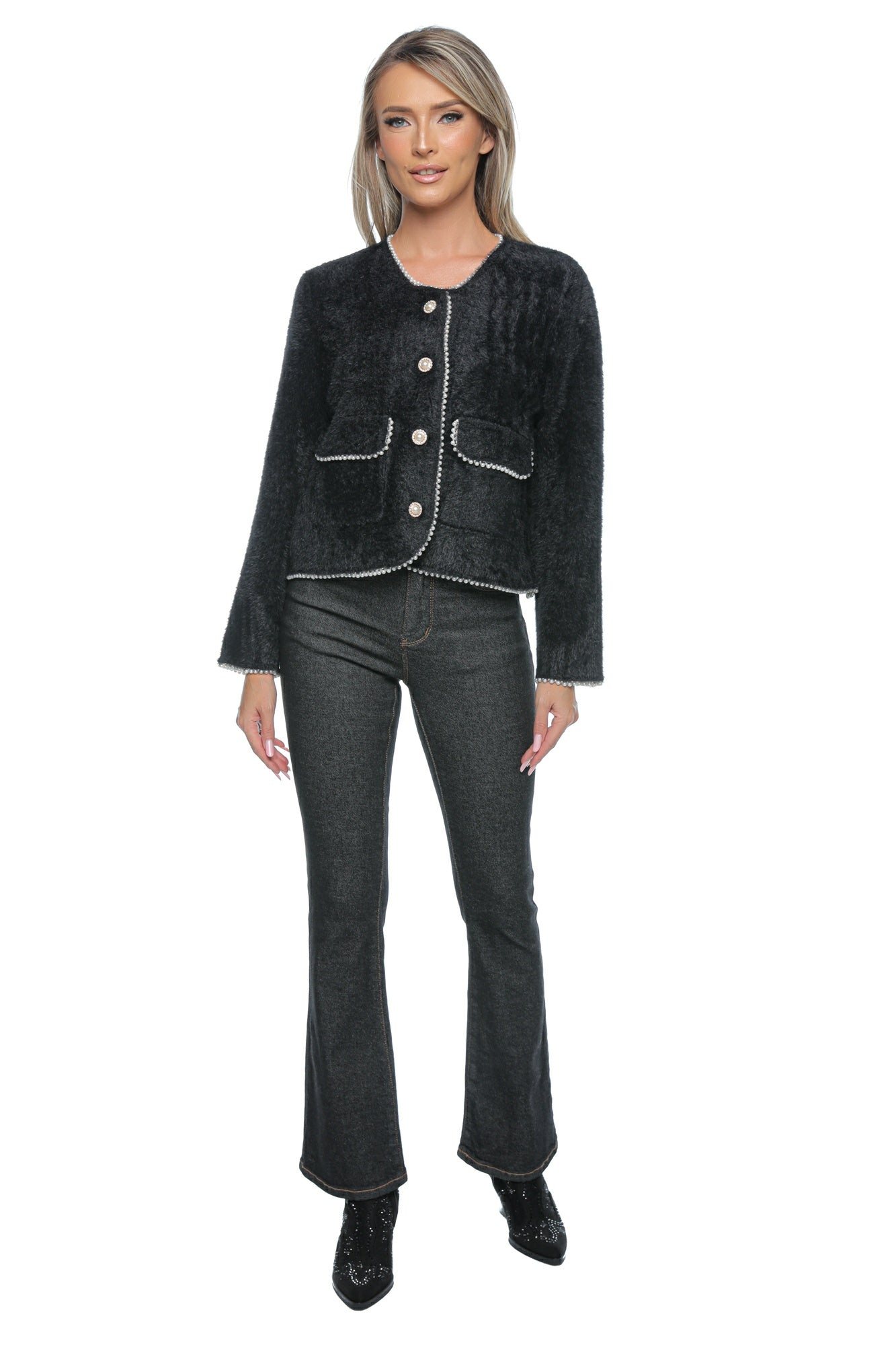 Jachetă damă scurtă din tricot pufos cu nasturi și detalii cu perle