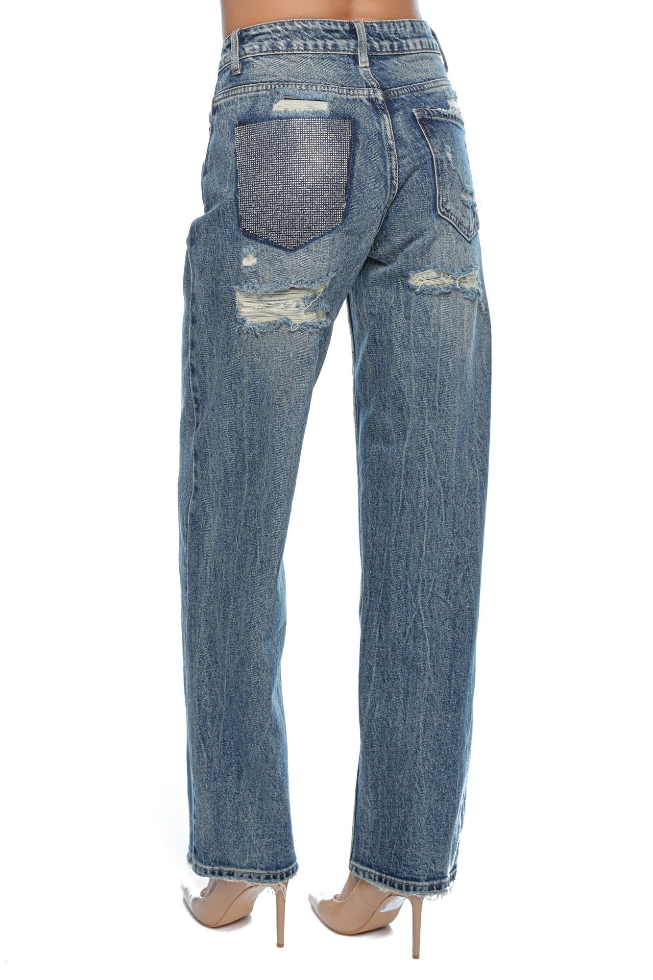 Descriere: Blugi boyfriend dama realizați din denim rezistent, cu aspect uzat și rupturi stilizate. Croiala lejeră oferă confort pe tot parcursul zilei, iar buzunarul la spate decorat cu pietre adaugă o notă glam și originală.
