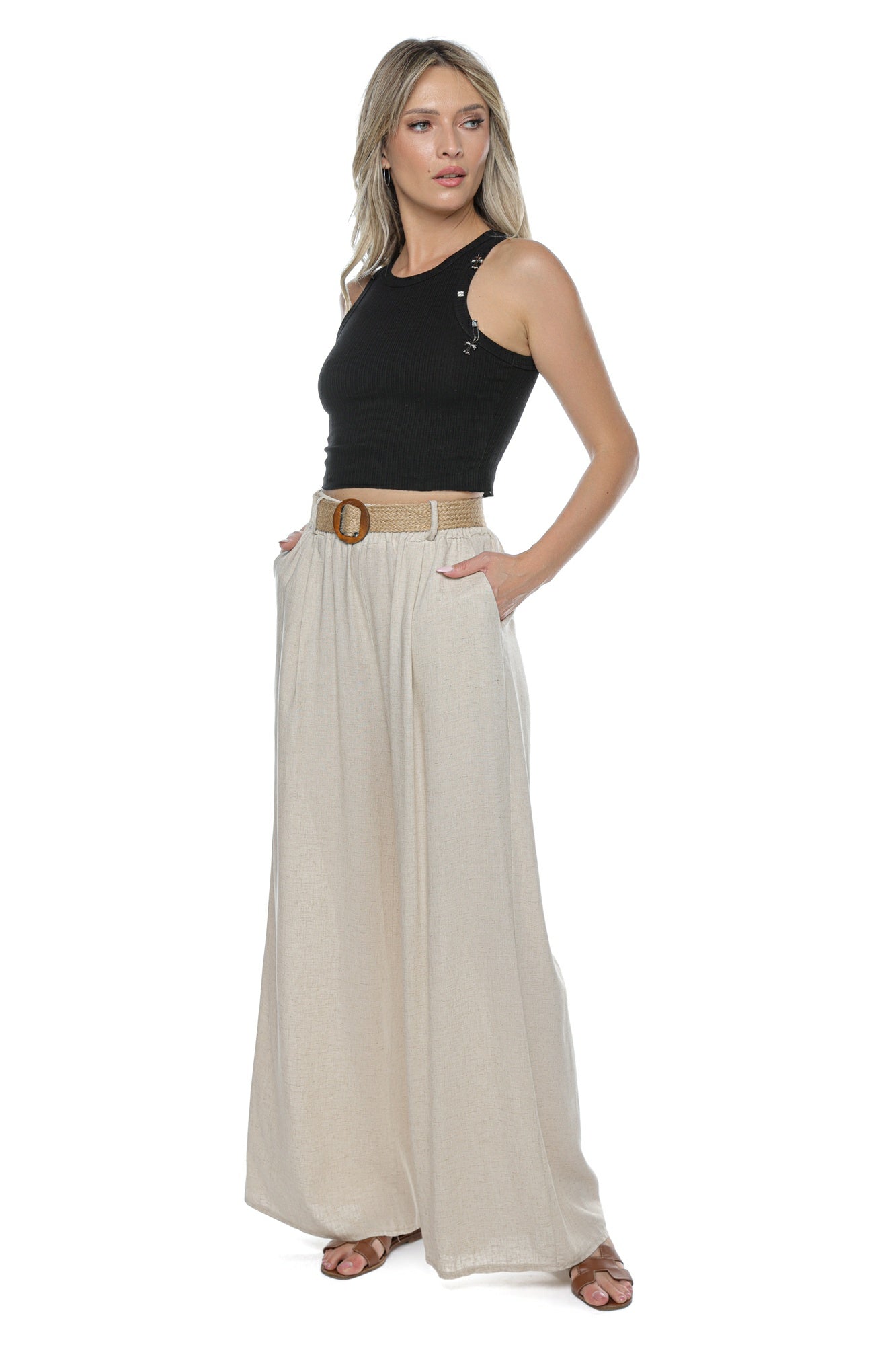 Descriere: Pantaloni dama largi cu banta elastica in talie..Buzunare oblice functionale. Accesorizati cu o curea lat din sfoara decorata cu o catarama rotunda din lemn.
