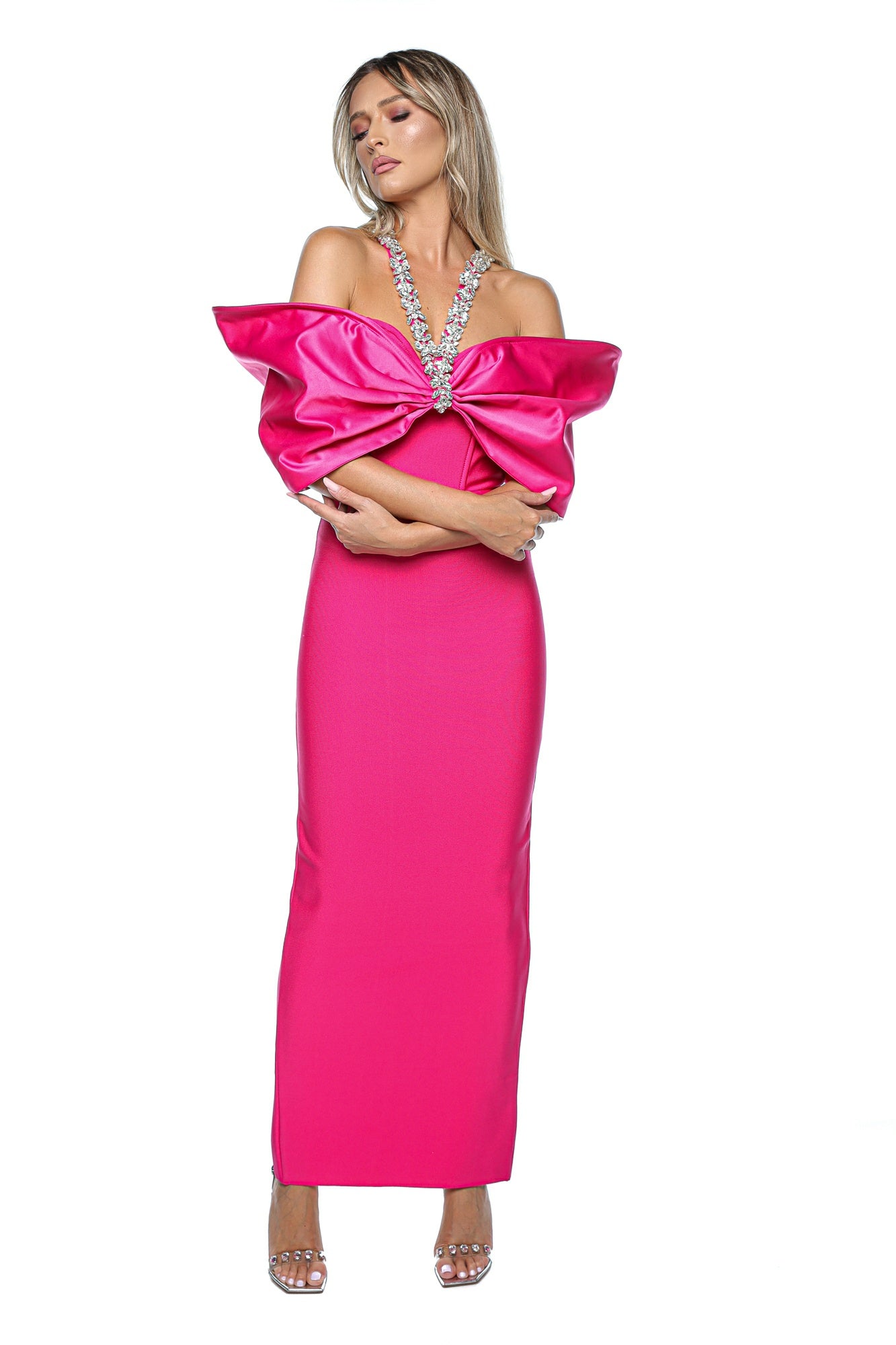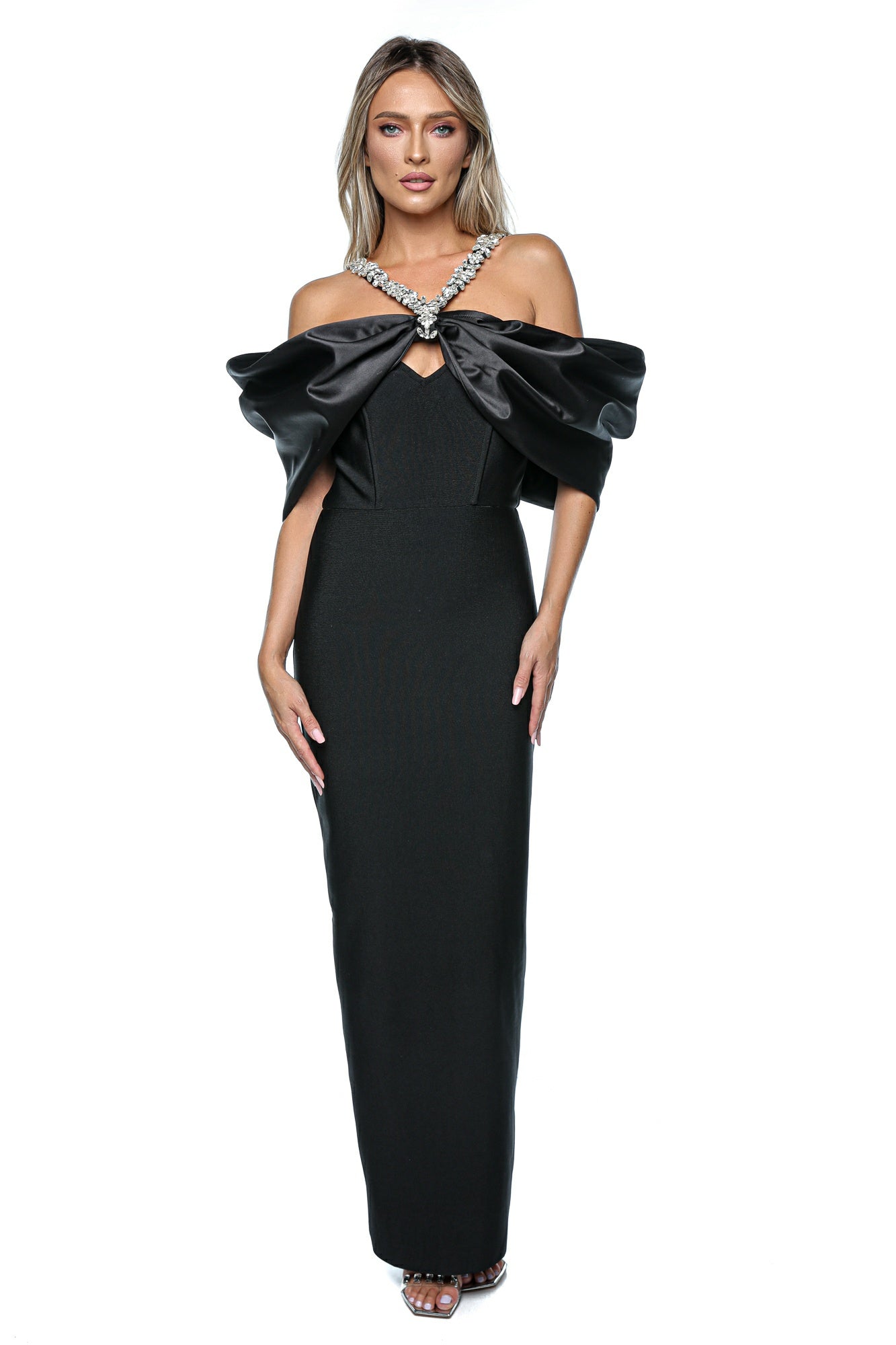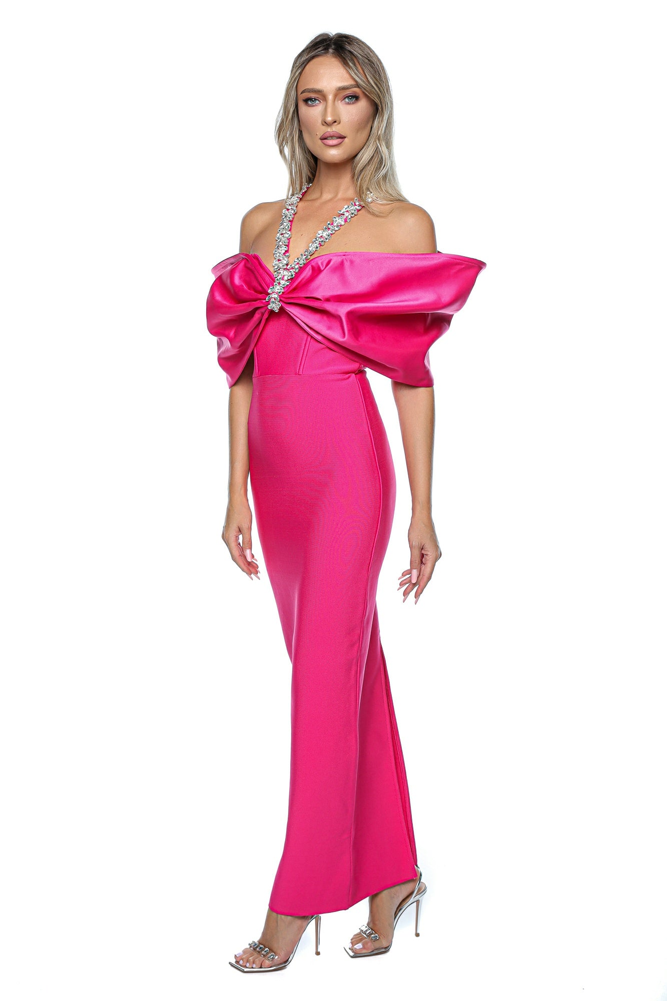 Descriere: Rochie impresionantă, perfectă pentru ocazii speciale, care combină rafinamentul cu un design îndrăzneț. Bustul este accesorizat cu bretele decorate cu aplicații strălucitoare și un detaliu amplu tip fundă din satin, ce pune în valoare decolteul. Croiala mulată și lungimea maxi conturează frumos silueta, iar spatele cu detalii elegante adaugă un plus de glamour.