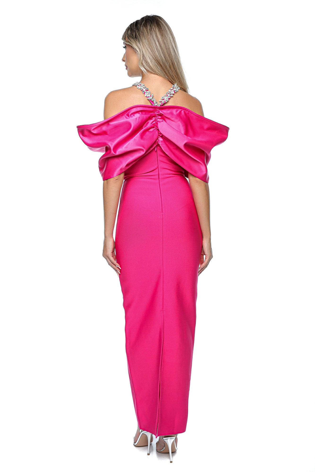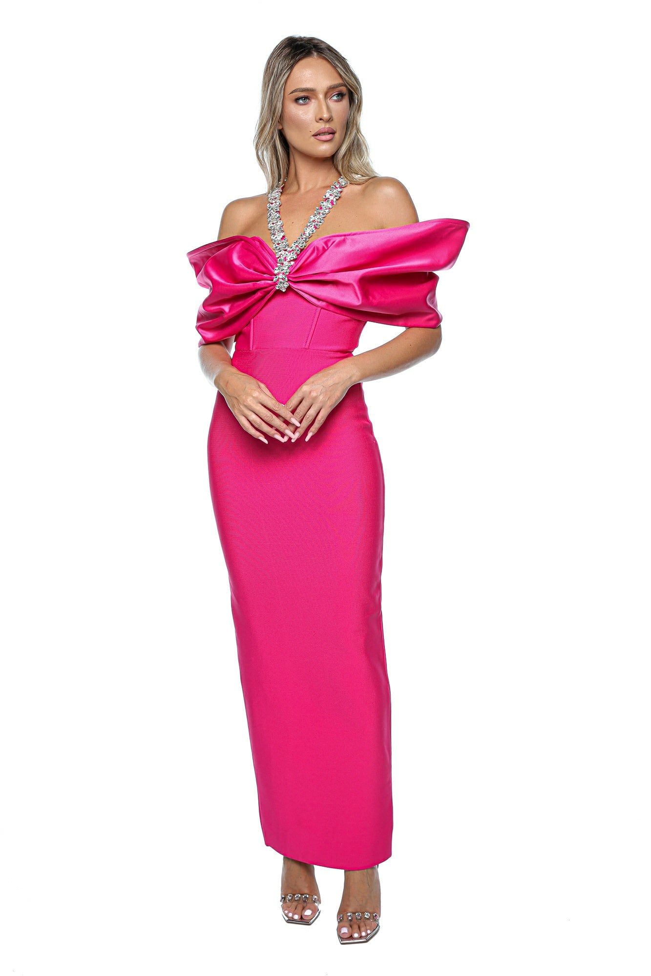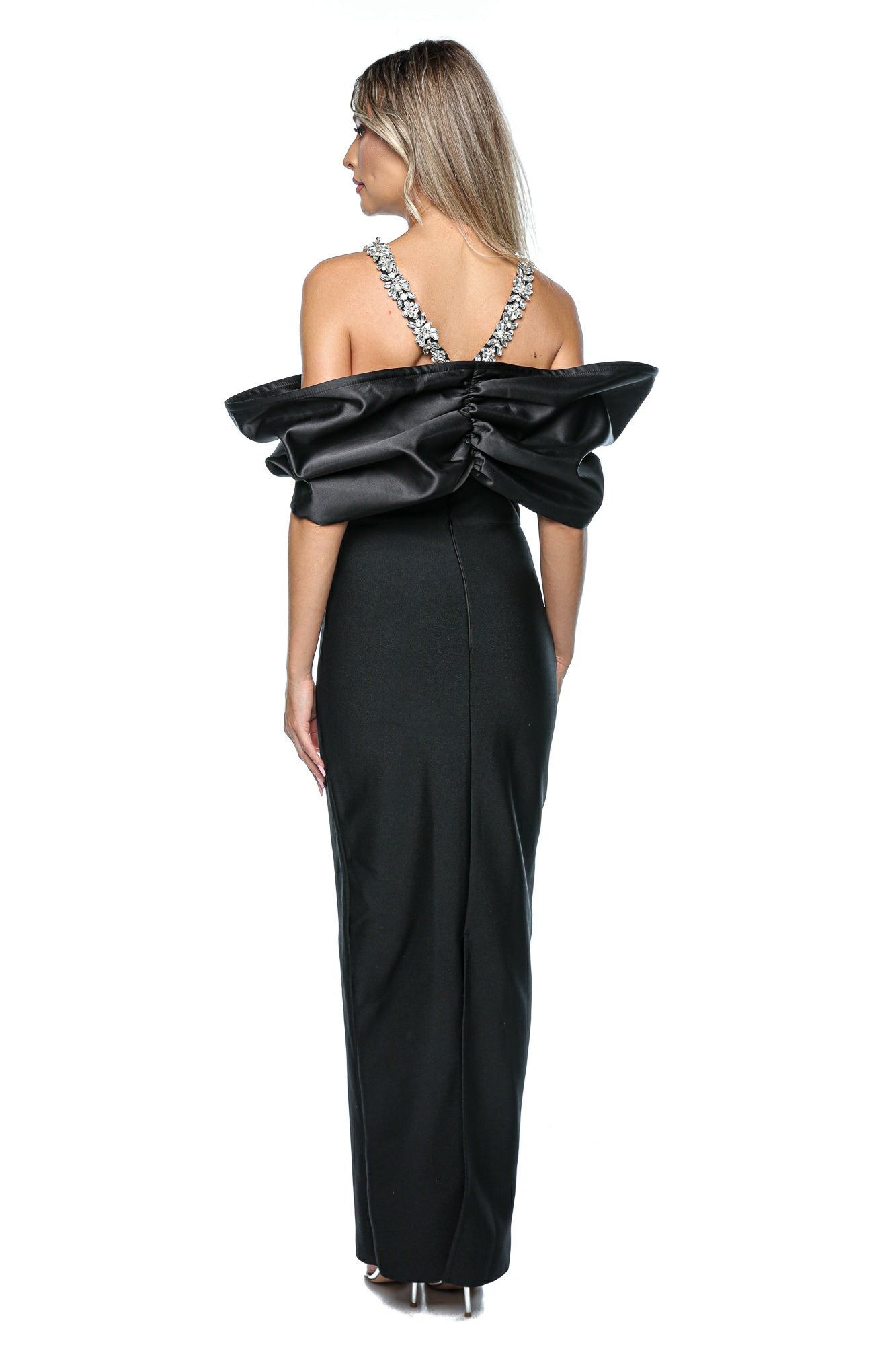 Descriere: Rochie impresionantă, perfectă pentru ocazii speciale, care combină rafinamentul cu un design îndrăzneț. Bustul este accesorizat cu bretele decorate cu aplicații strălucitoare și un detaliu amplu tip fundă din satin, ce pune în valoare decolteul. Croiala mulată și lungimea maxi conturează frumos silueta, iar spatele cu detalii elegante adaugă un plus de glamour.