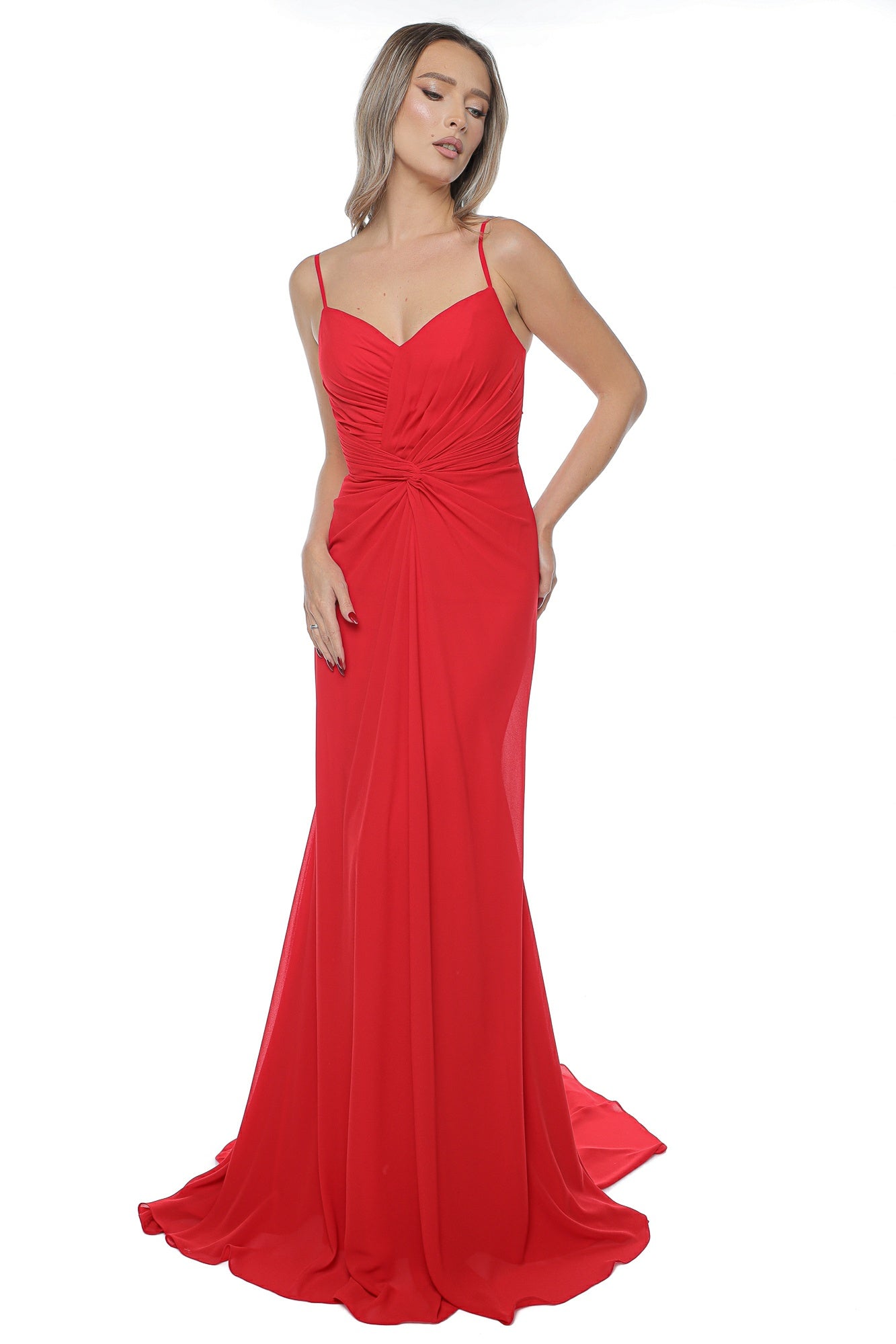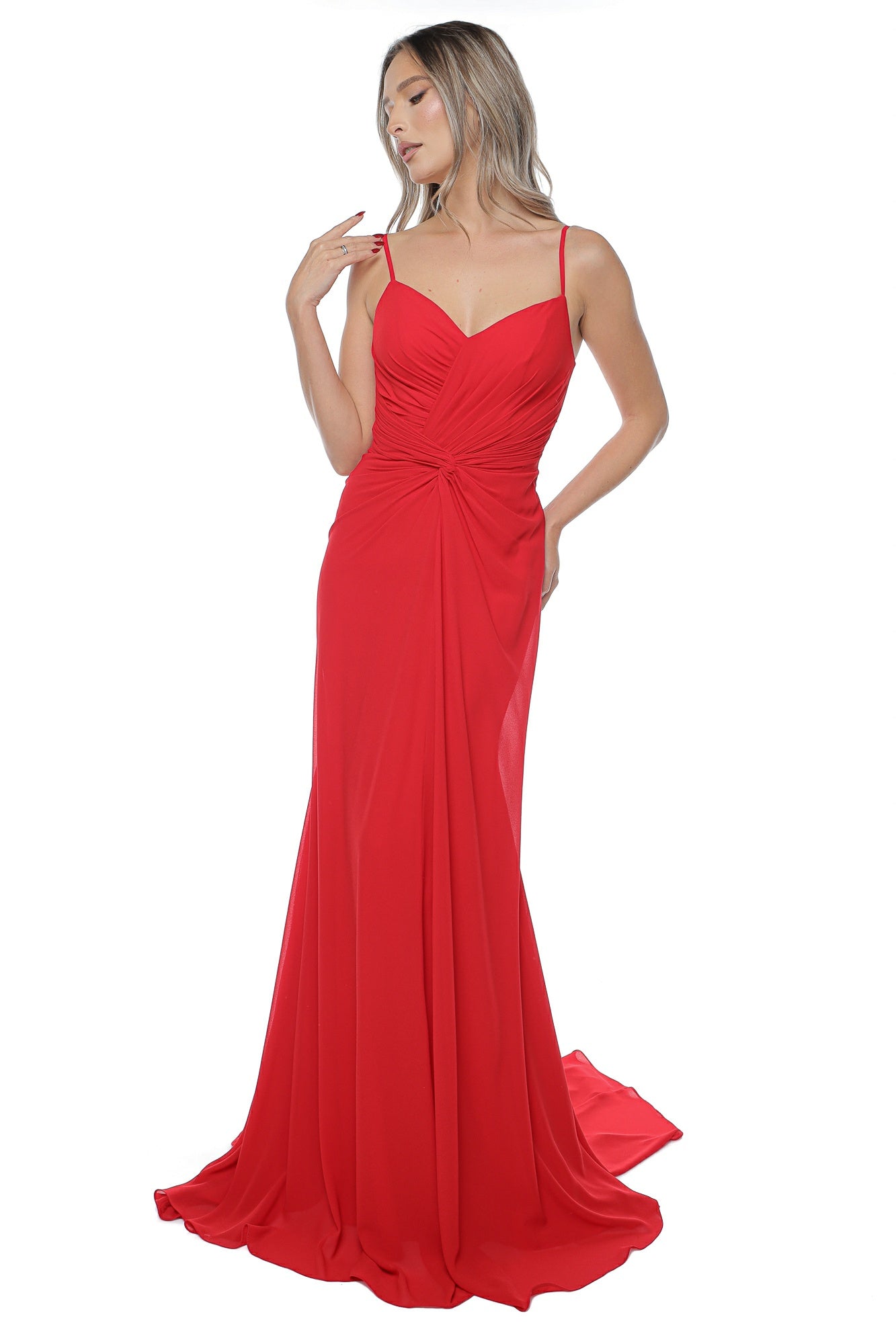 Descriere: Rochie rosie lunga eleganta din voal cu trena. Model cu bretele reglabile. Cupe intarite. Model cu clin amplu la spate. Drapata.Se inchide cu fermoar la spate. Captusita.