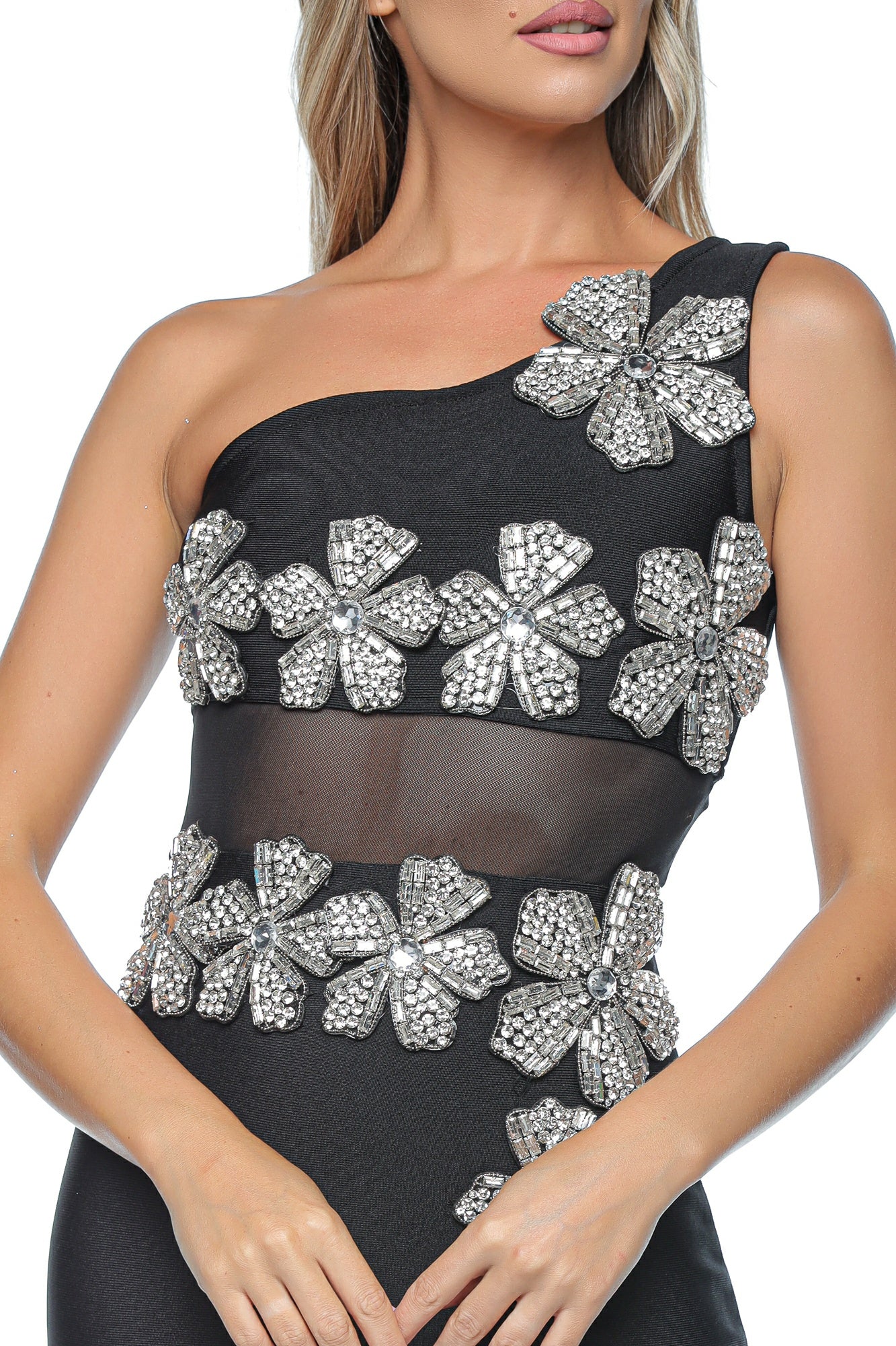 Descriere: Rochie elegantă de seară în stil sirenă, perfectă pentru evenimente de gală, nunți sau petreceri de lux. Modelul cu un umăr gol și inserție transparentă în talie adaugă senzualitate, în timp ce aplicațiile florale strălucitoare conferă un aer sofisticat și glam.