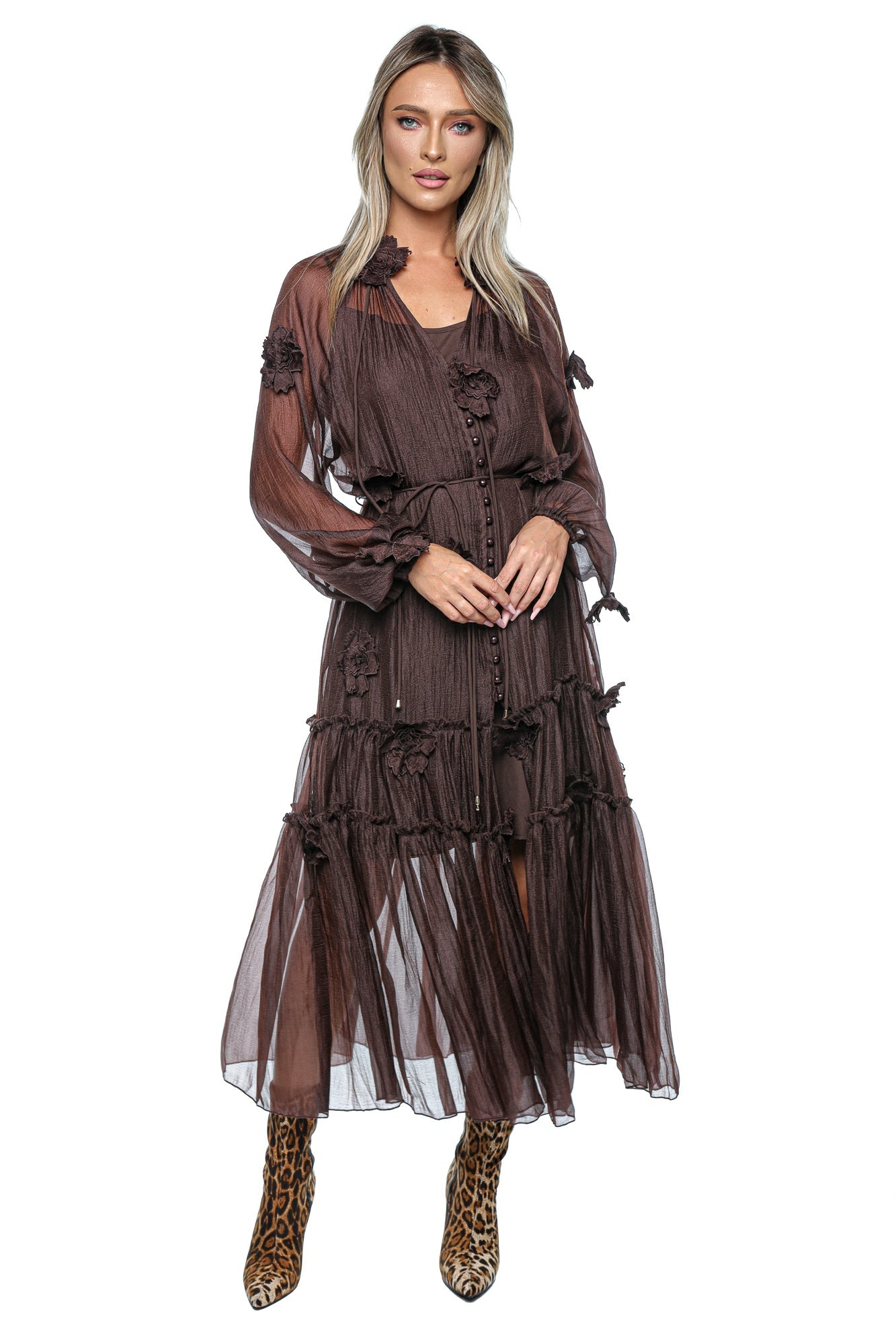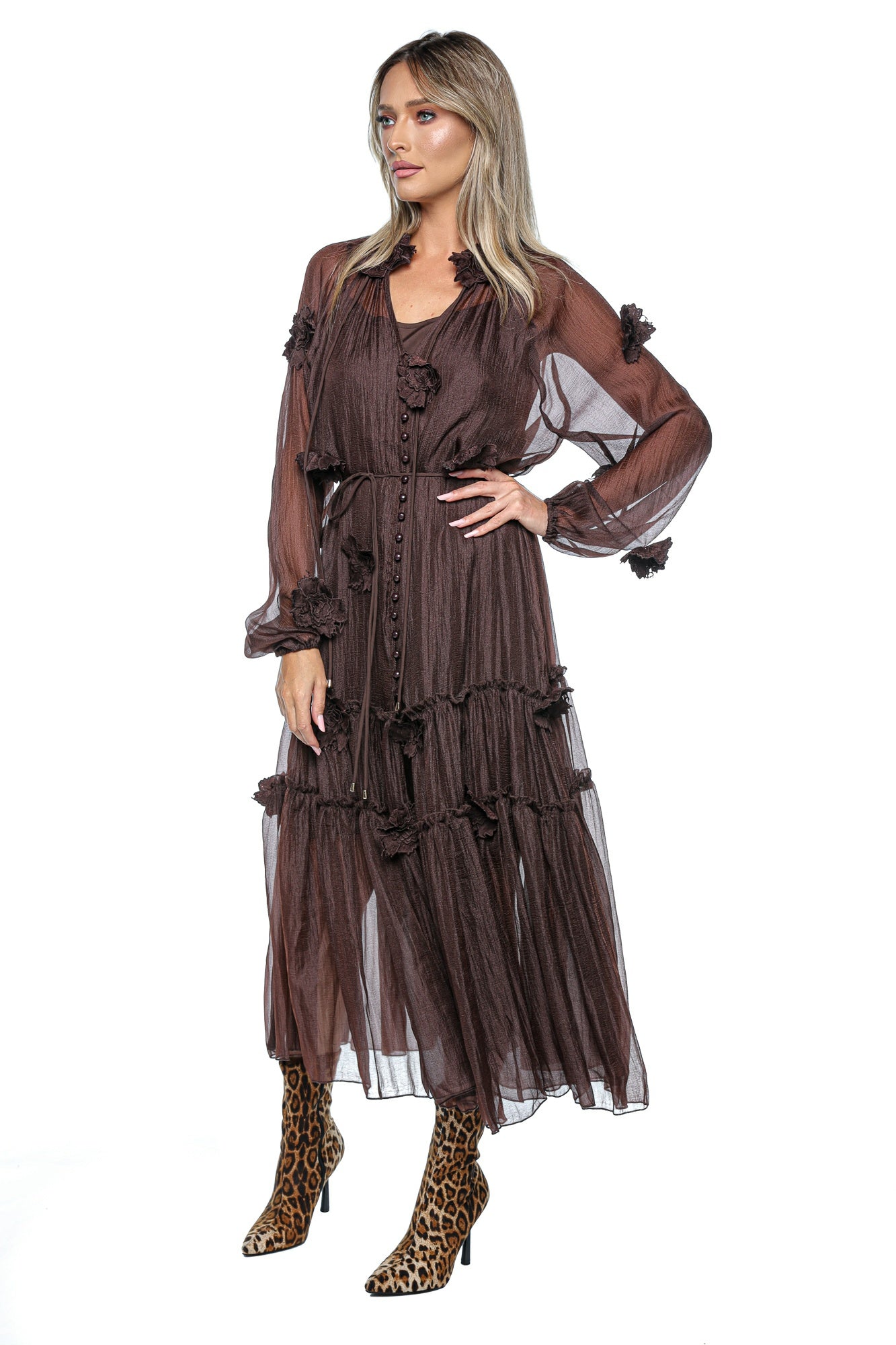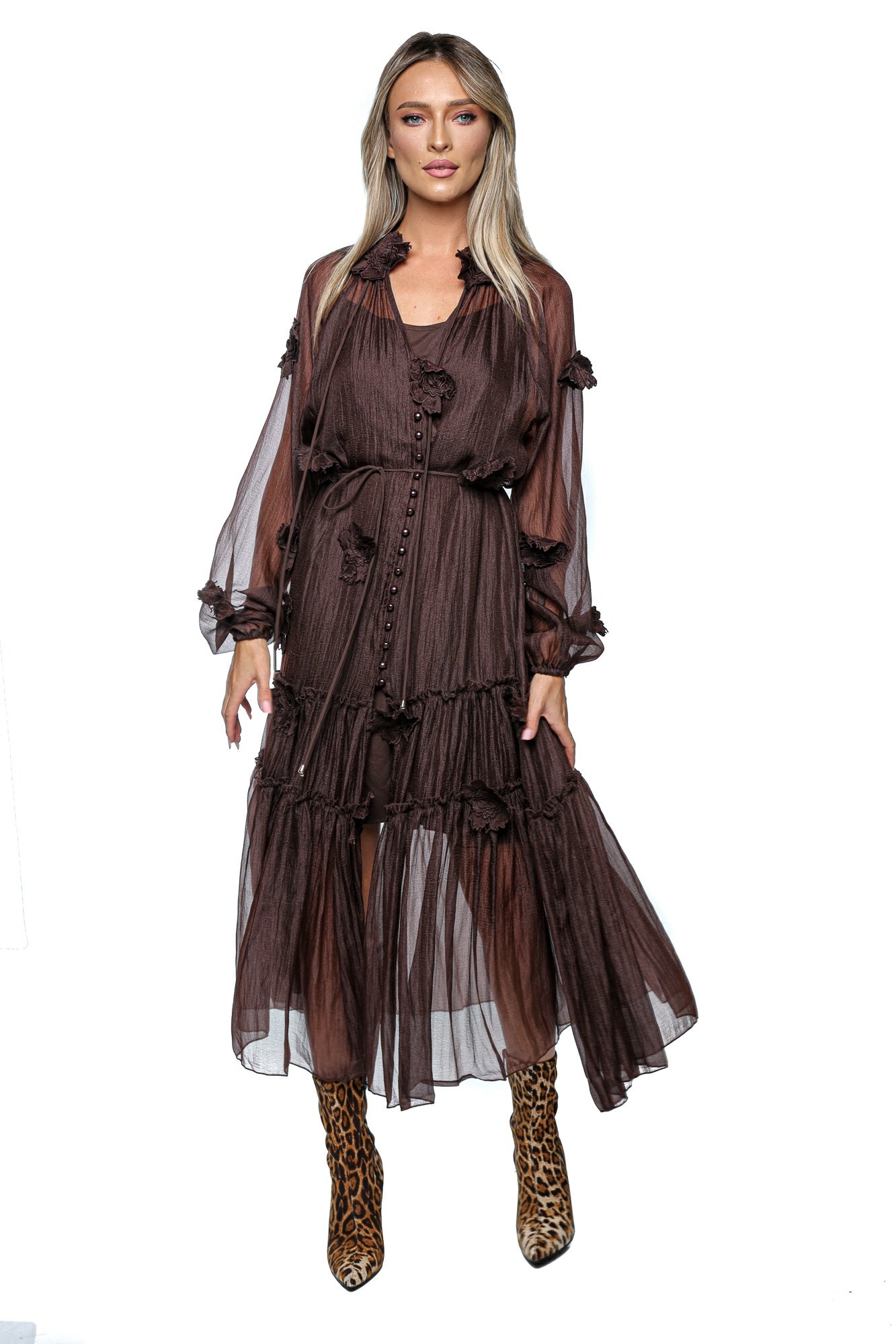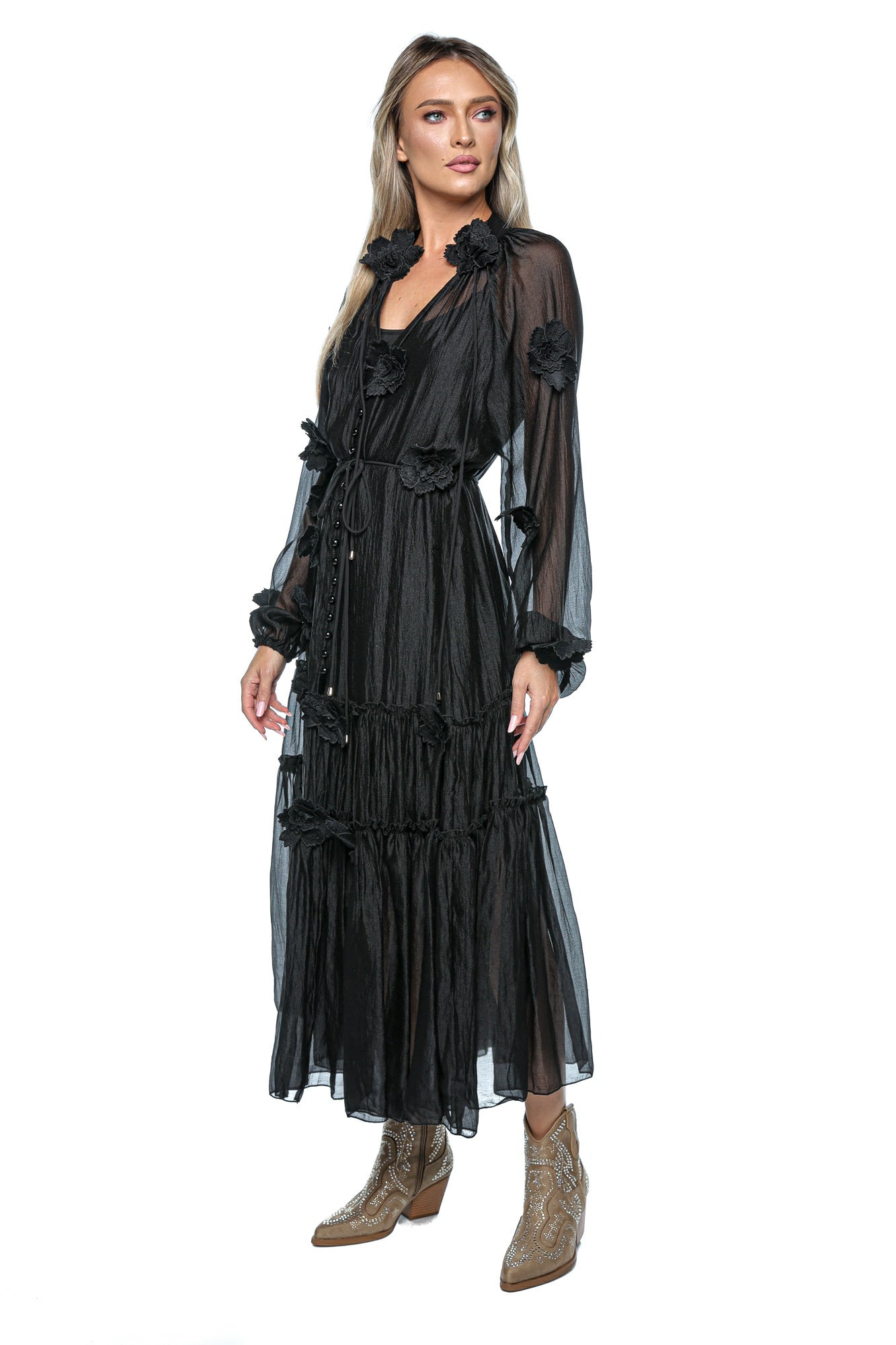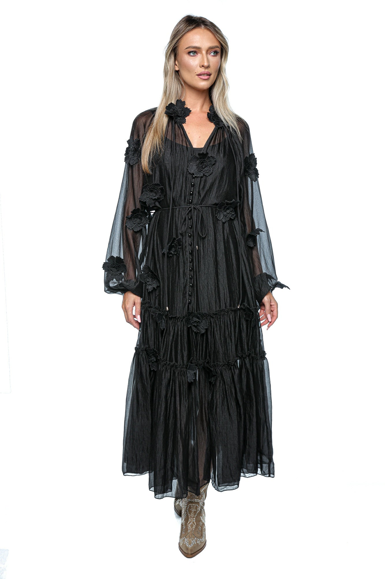 Descriere: Rochie boemă și elegantă se remarcă prin materialul vaporos din voal și detaliile florale 3D aplicate manual. Croiala lejeră, cu fustă amplă în straturi și mâneci transparente, oferă o notă romantică și feminină. Închiderea cu nasturi pe partea frontală și cordonul subțire în talie accentuează silueta într-un mod discret și rafinat.