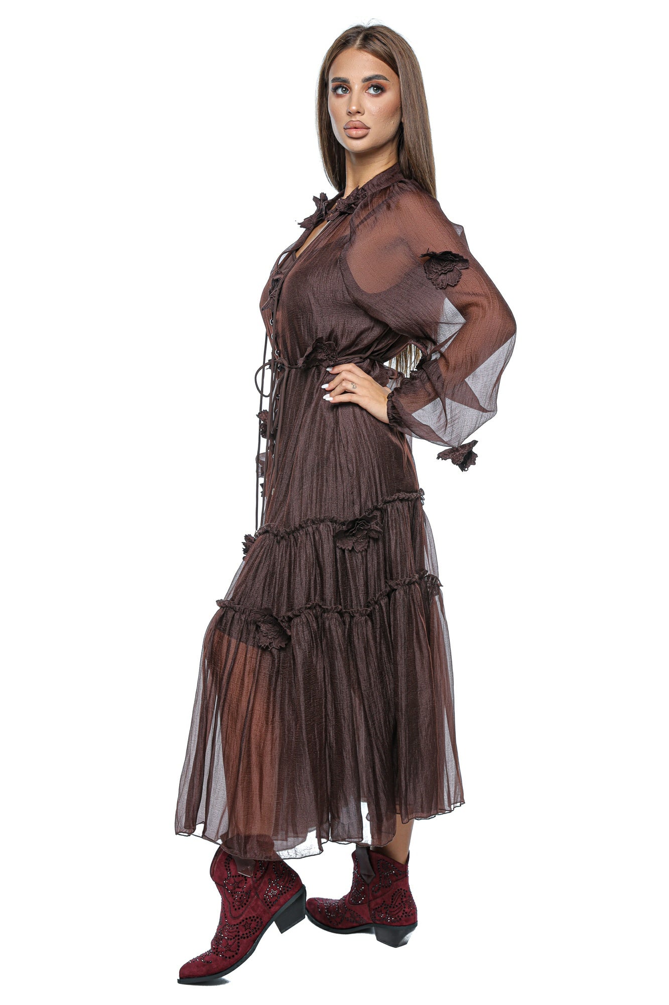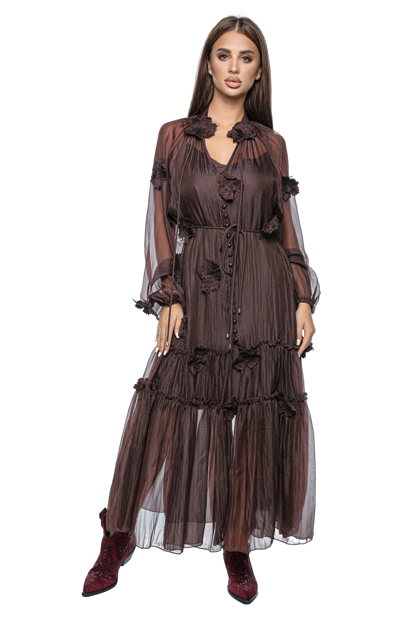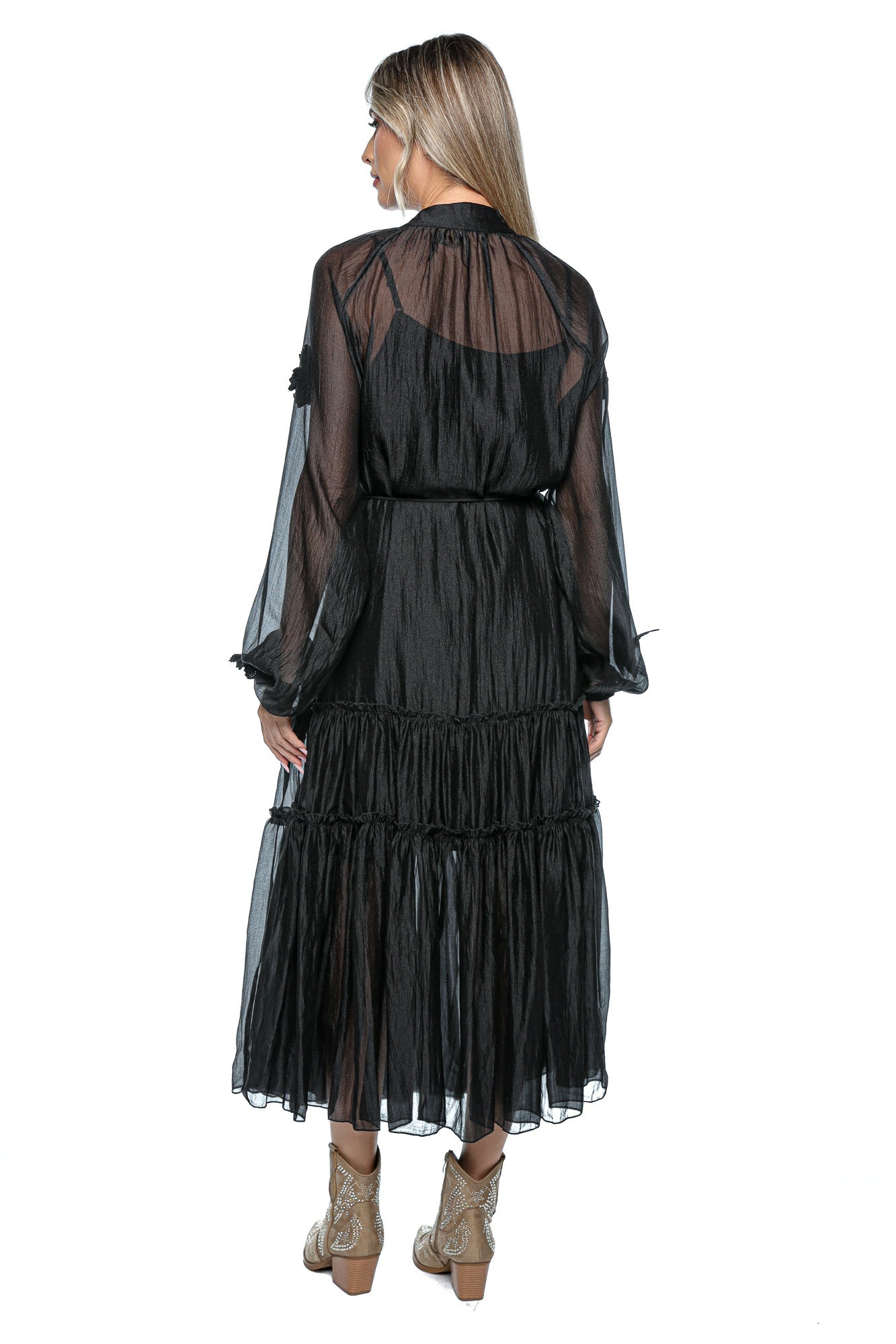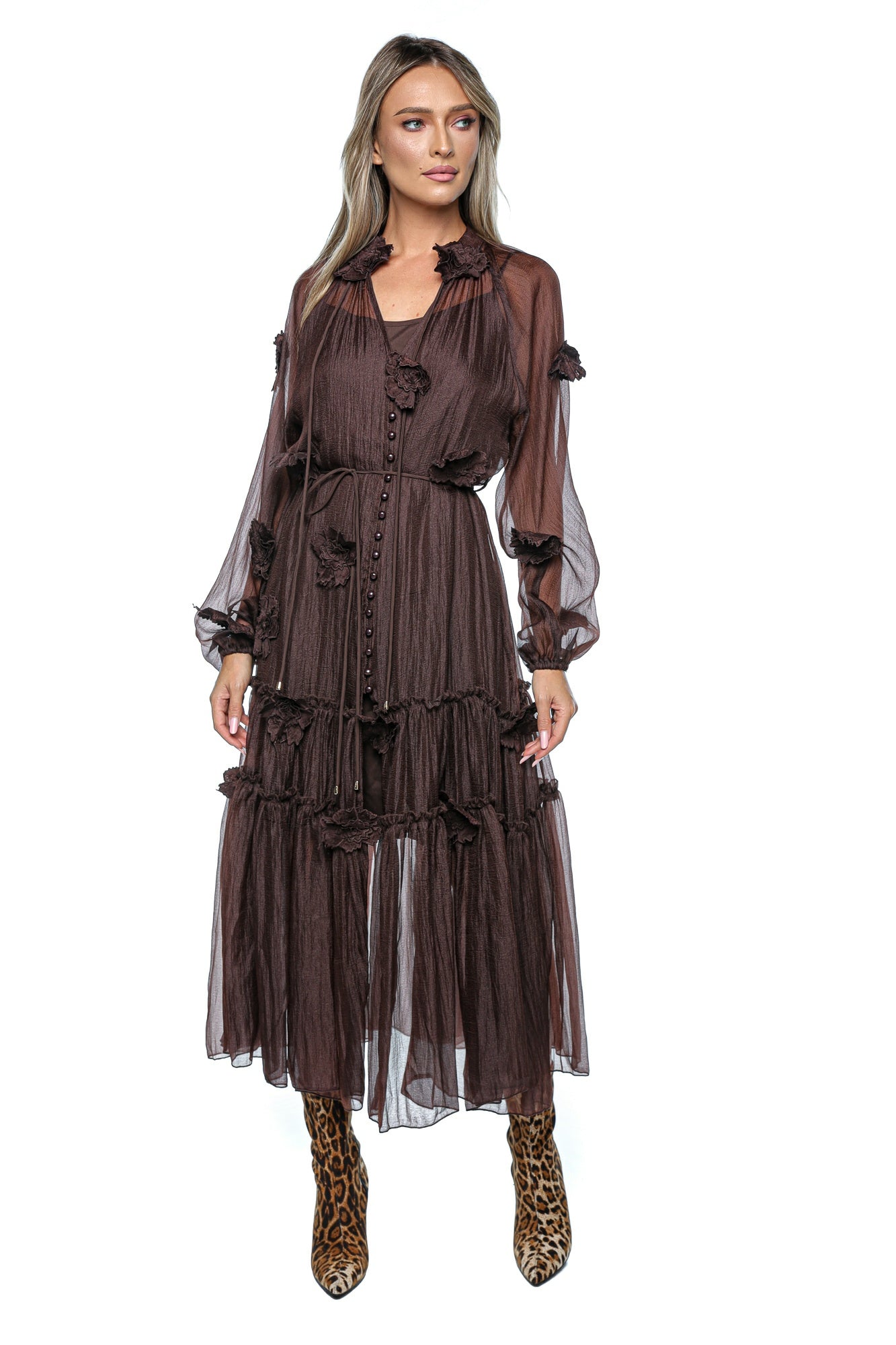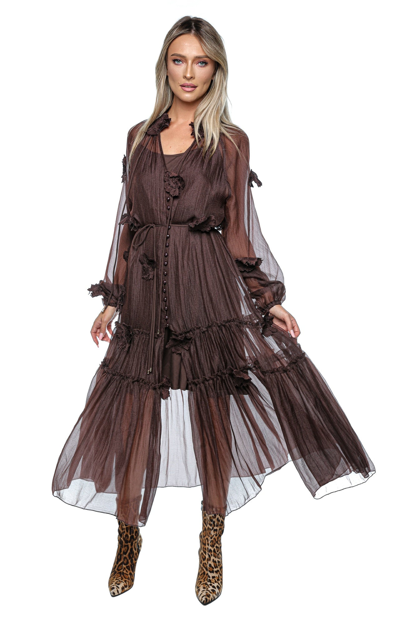 Descriere: Rochie boemă și elegantă se remarcă prin materialul vaporos din voal și detaliile florale 3D aplicate manual. Croiala lejeră, cu fustă amplă în straturi și mâneci transparente, oferă o notă romantică și feminină. Închiderea cu nasturi pe partea frontală și cordonul subțire în talie accentuează silueta într-un mod discret și rafinat.