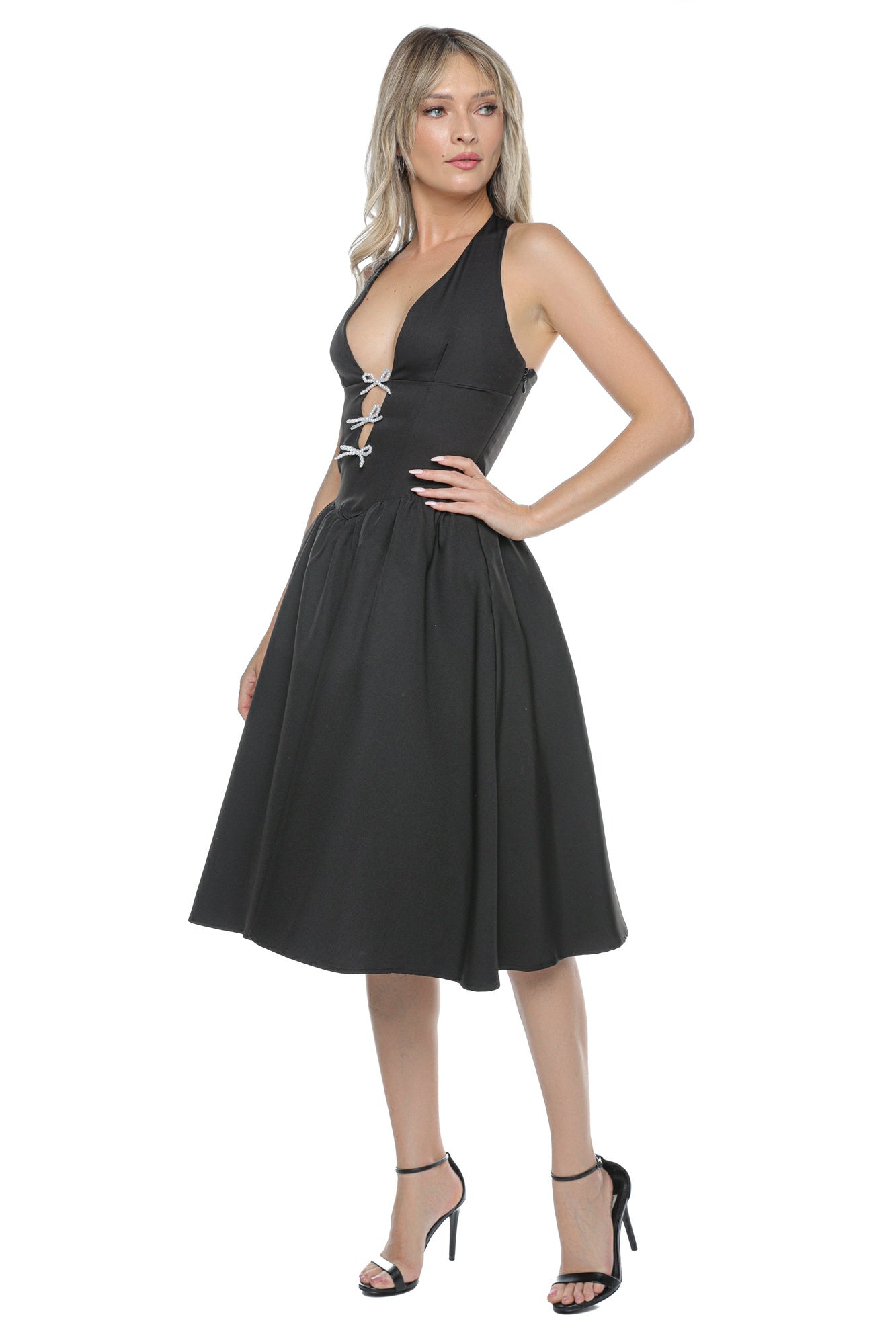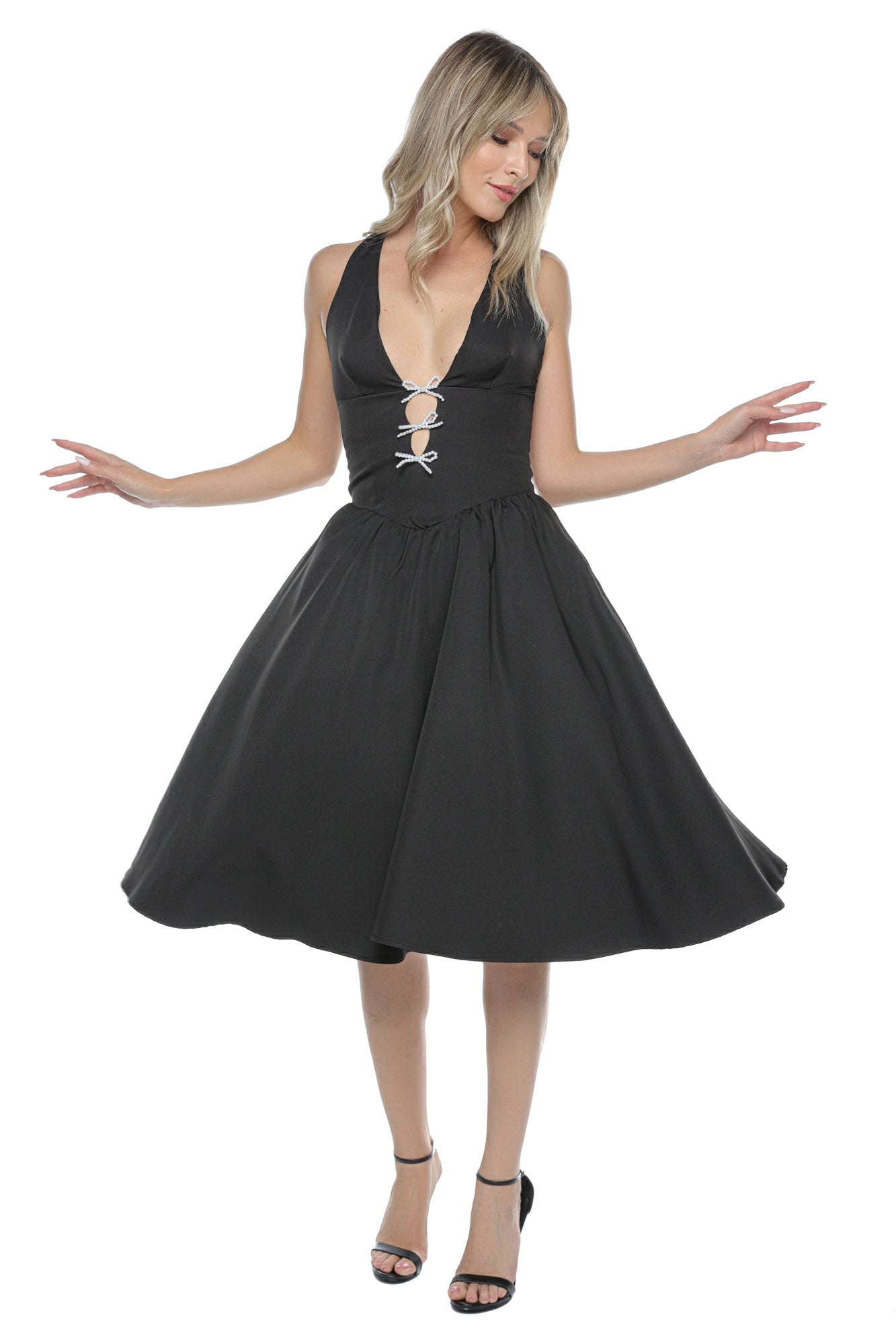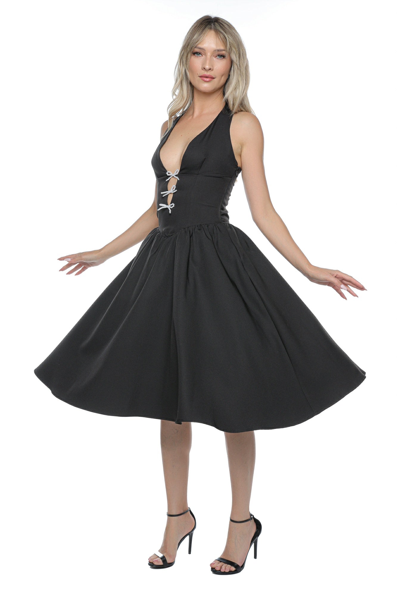 Descriere: Rochie neagra eleganta baby doll. Partea de sus tip corset cu decolteu adanc cu trei fundite decorative din perle albe. Guler halter care se leaga la gat. Fusta larga dublata cu tulle pentru ai da volum. Potrivita pentru petreceri, baluri sau evenimente de seara.
