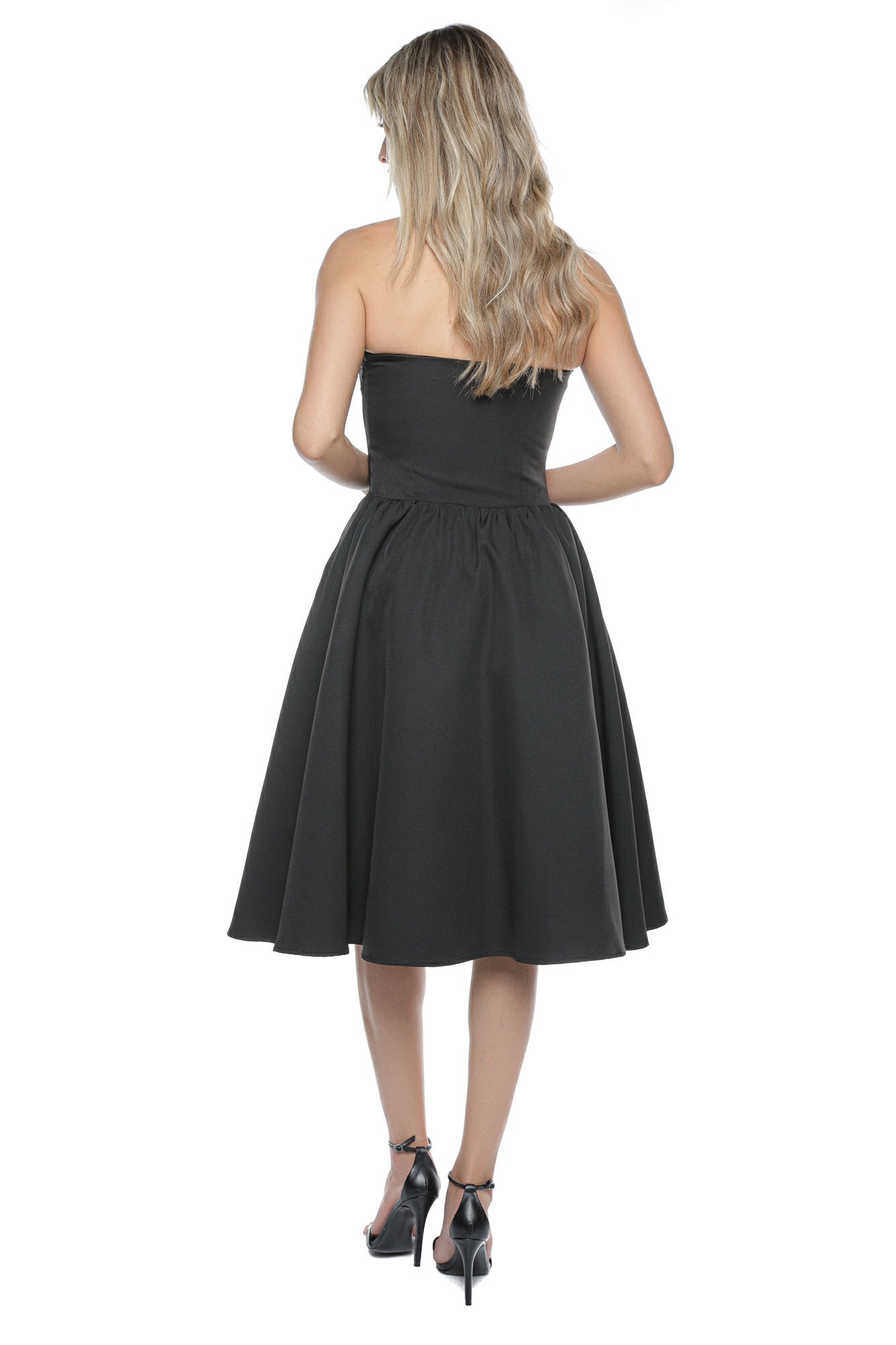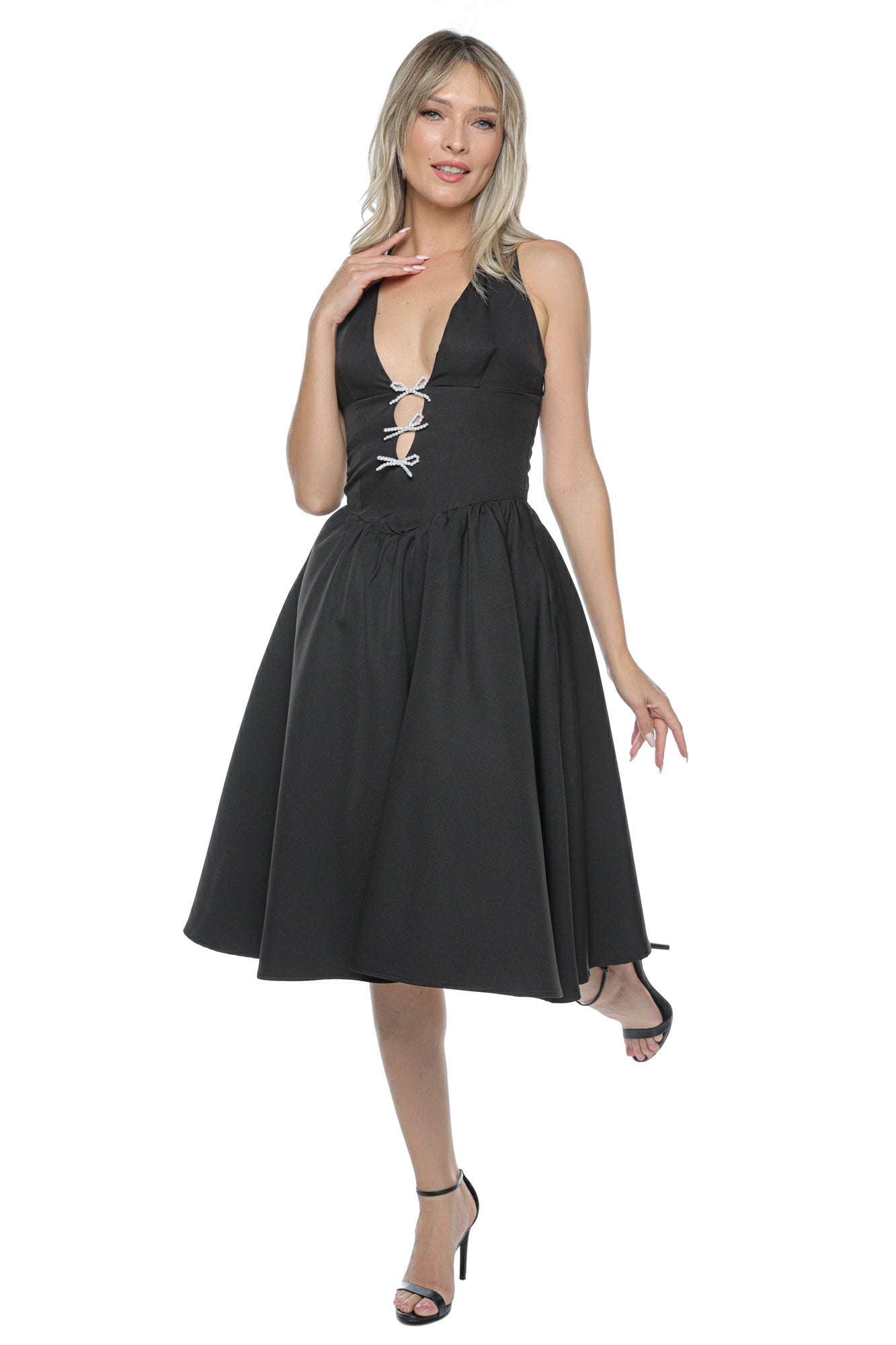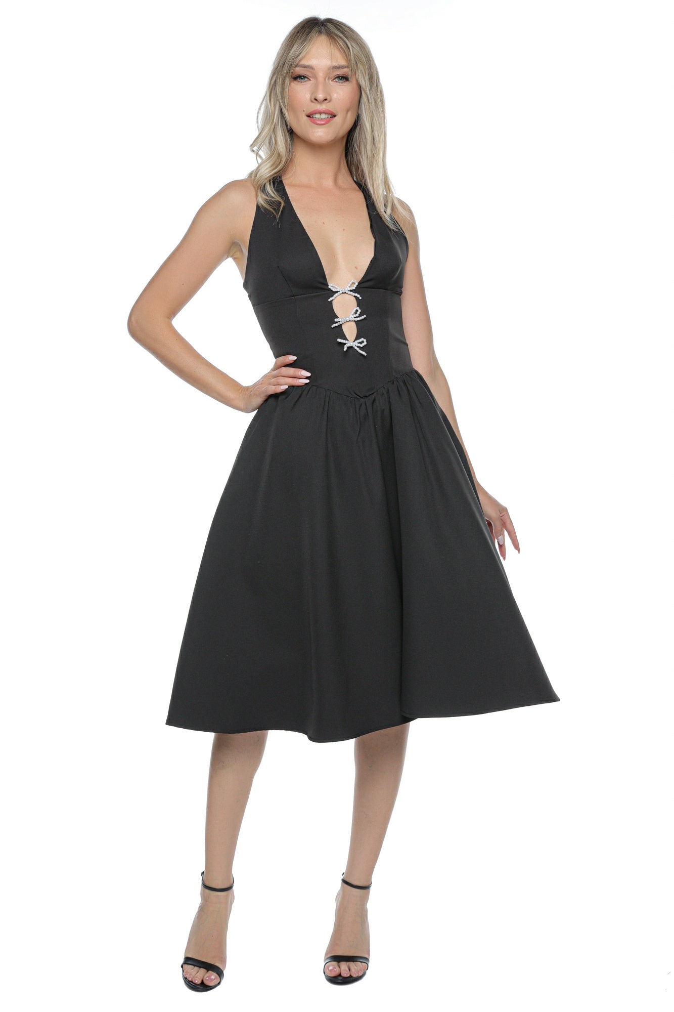 Descriere: Rochie neagra eleganta baby doll. Partea de sus tip corset cu decolteu adanc cu trei fundite decorative din perle albe. Guler halter care se leaga la gat. Fusta larga dublata cu tulle pentru ai da volum. Potrivita pentru petreceri, baluri sau evenimente de seara.