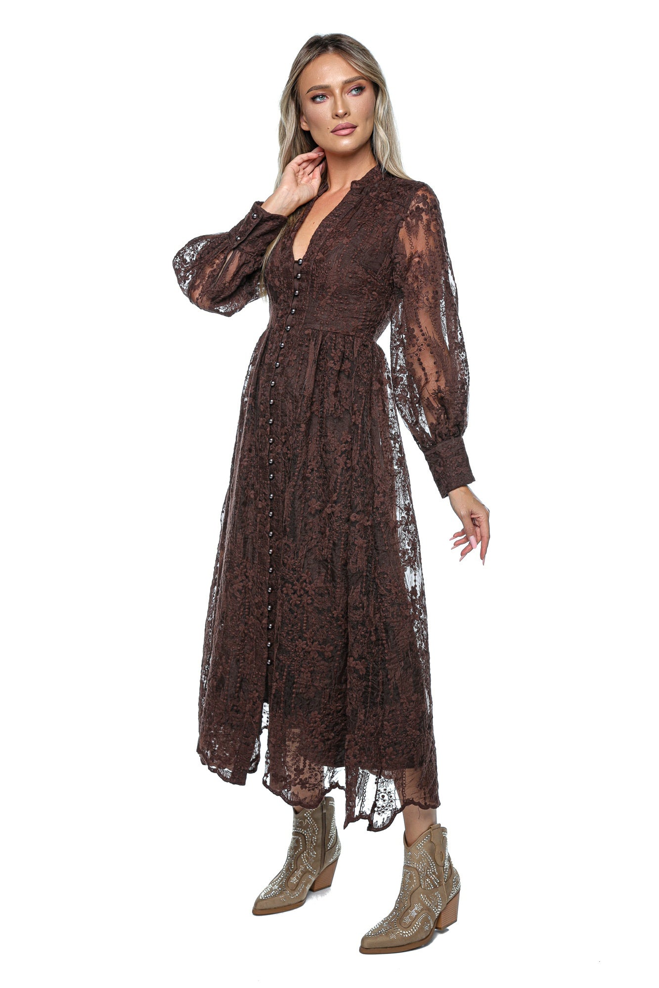 Descriere: Rochie elegantă și feminină, realizată din dantelă fină cu model floral, care pune în valoare rafinamentul și delicatețea. Croiala cu nasturi frontali adaugă un detaliu chic și practic, în timp ce mânecile lungi, ușor bufante, oferă un aer romantic. Decolteul în V și talia marcată subțiază silueta, iar lungimea midi o face potrivită pentru diverse ocazii – de la întâlniri elegante la evenimente speciale.