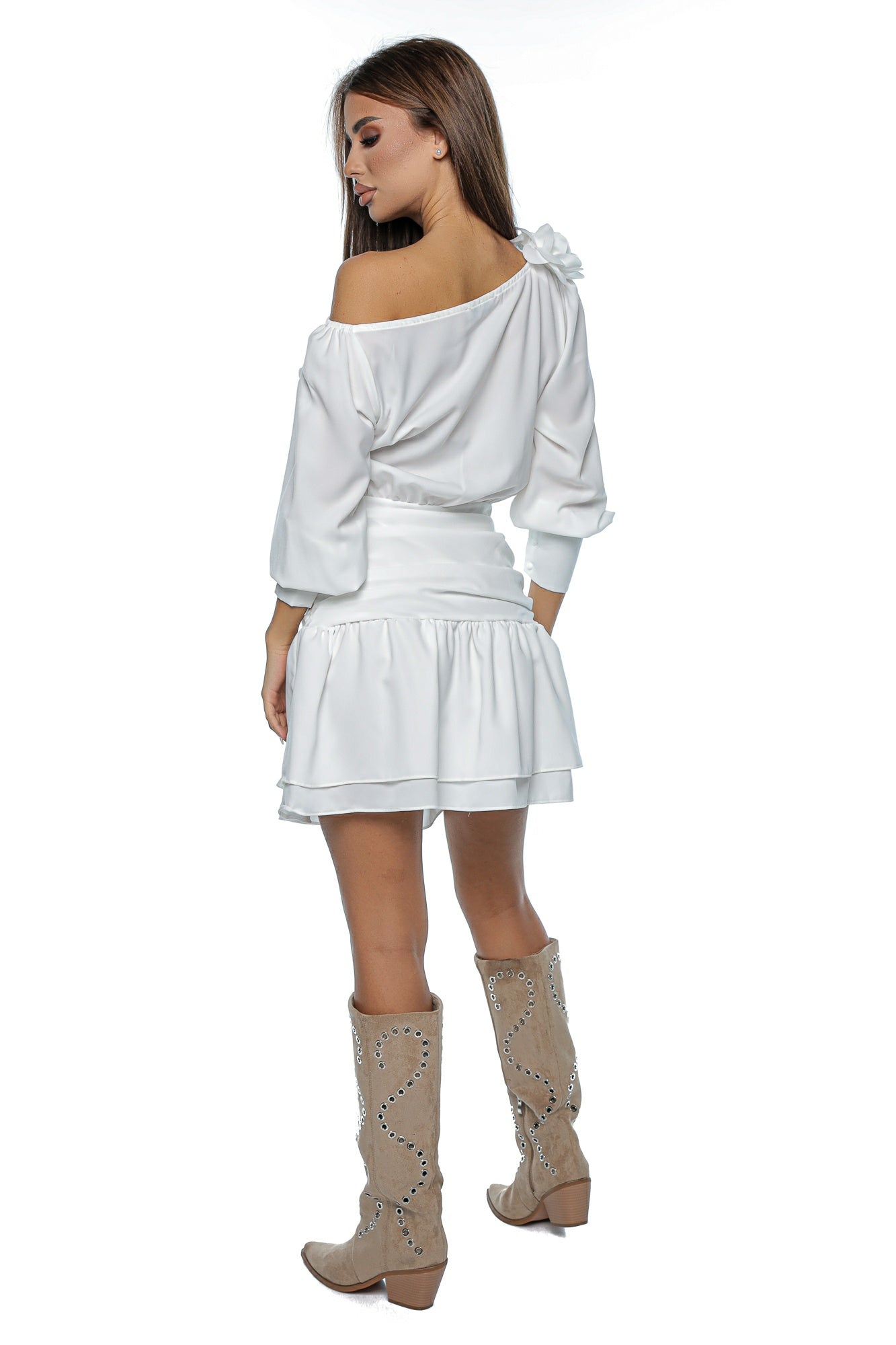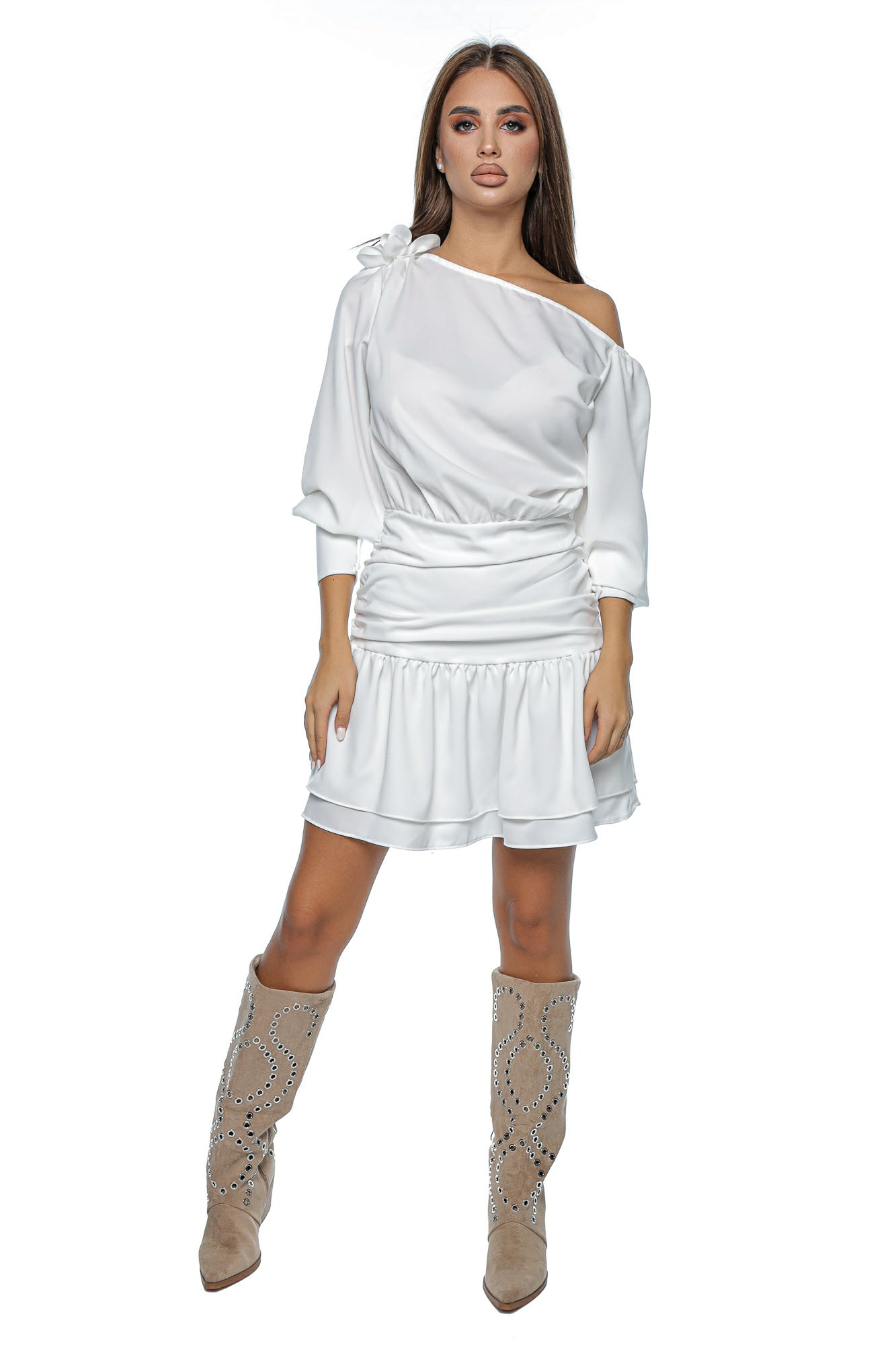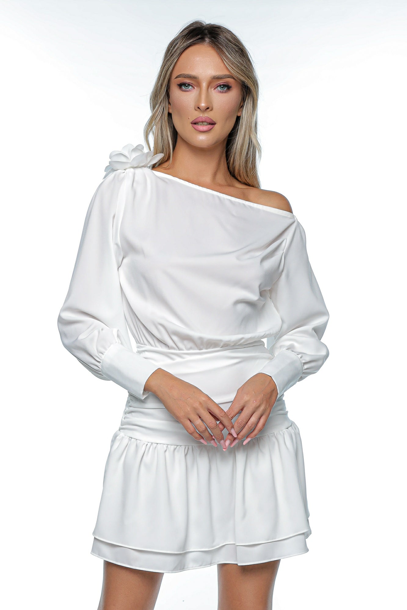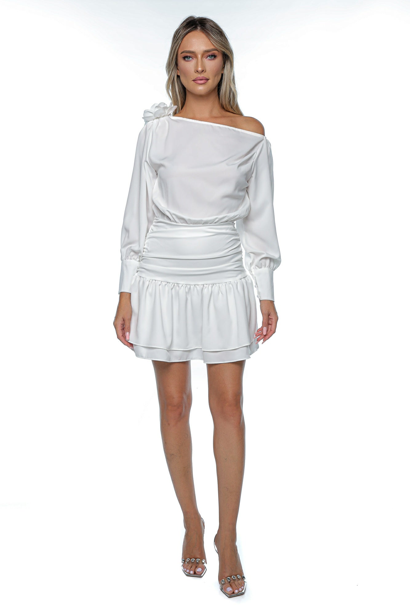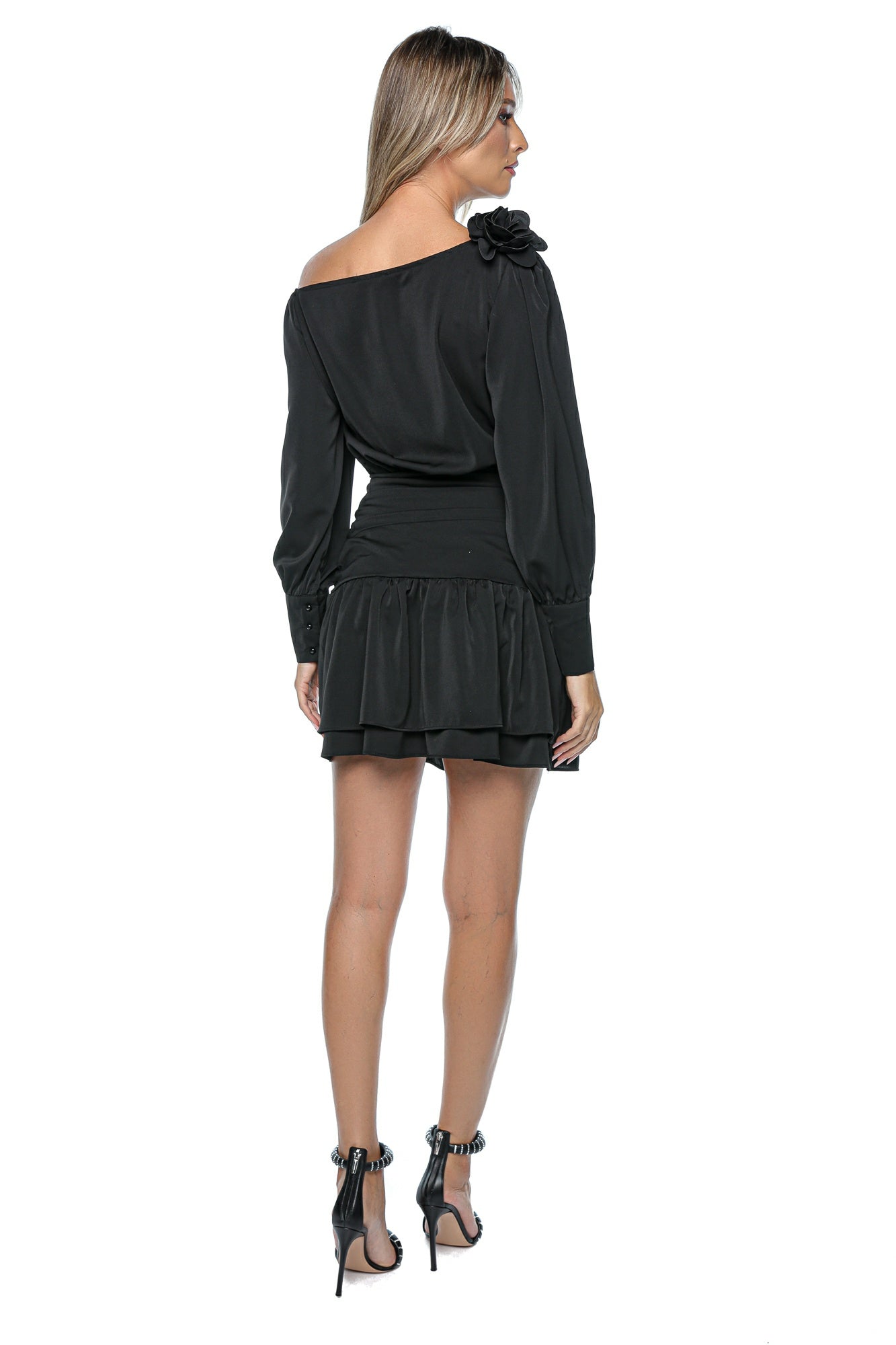 Descriere: Rochie chic ce îmbină eleganța și modernul prin croiala sa deosebită, cu un umăr gol decorat cu aplicație tip floare. Mânecile lungi, cu manșete clasice, adaugă un aer sofisticat, în timp ce talia evidențiată și fusta cu volane oferă lejeritate și feminitate.