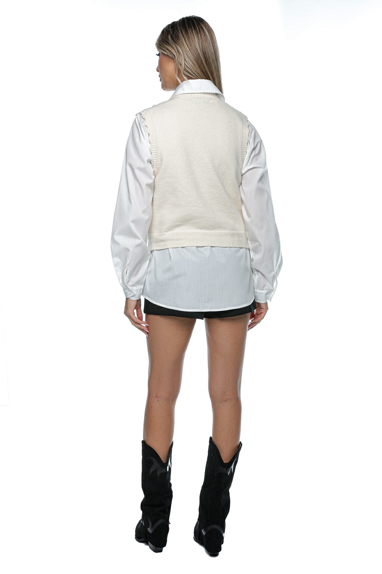 Descriere: Set dama camasa si vesta tricotata este alegerea ideala pentru un look modern, feminin si confortabil. Camasa clasica, cu maneci lungi si croi lejer, ofera eleganta si versatilitate, in timp ce vesta tricotata, cu detalii in relief si aplicatii decorative, adauga un plus de stil si rafinament.