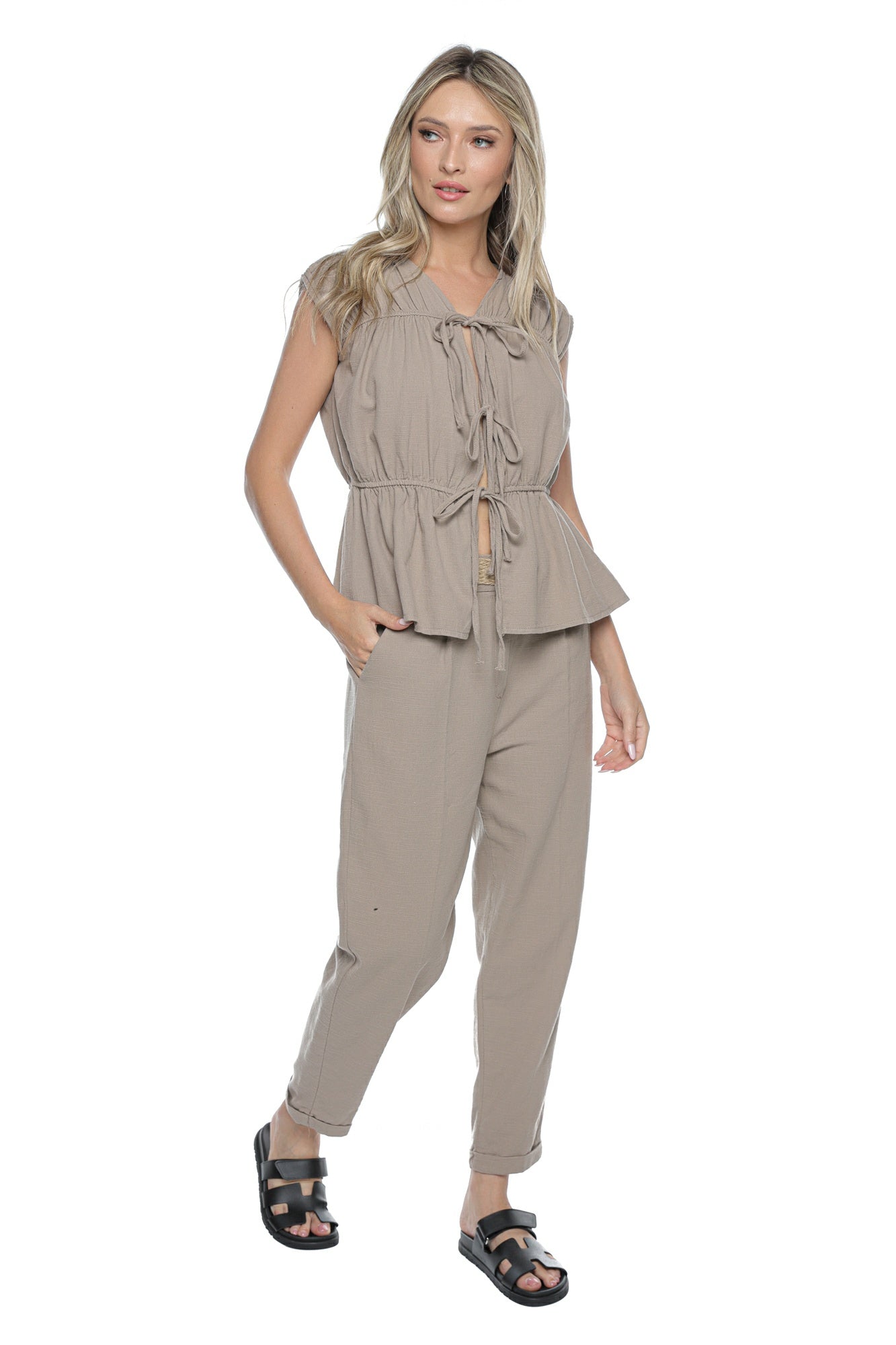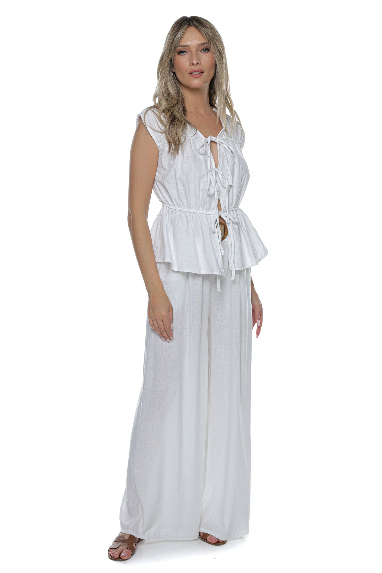 Detalii cu șnururi decorative în față, care adaugă un aer boem și permit ajustarea decolteului.